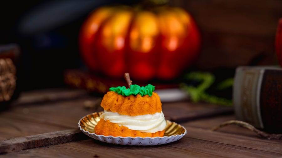 - Pumpkin Bundt Cake: Pumpkin-flavored cake filled with dulce de leche and cream cheese frosting finished with chocolate stem and mousse leaf