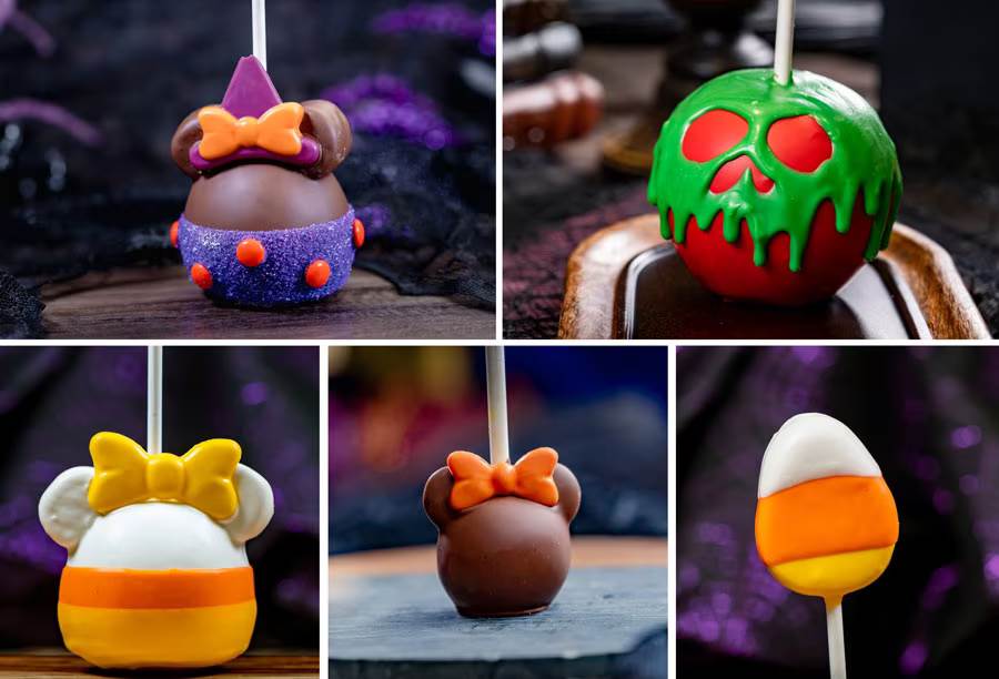 - Minnie Witch Caramel Apple: Green Granny Smith apple dipped in caramel with marshmallow ears enrobed in milk chocolate and embellished with a purple skirt, orange M&M’S Milk Chocolate candies, and a chocolate with hat
