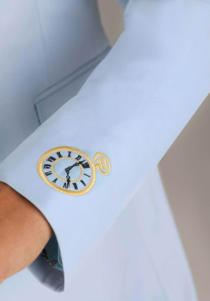 - Speaking of the sleeves, when uncuffed, each has a small character detail embroidered near the cuff that ties the whole ensemble together. Designs include a hibiscus flower (Lilo & Stitch), bumble bee (Pooh), Simba (The Lion King), and a pocket watch (Alice)