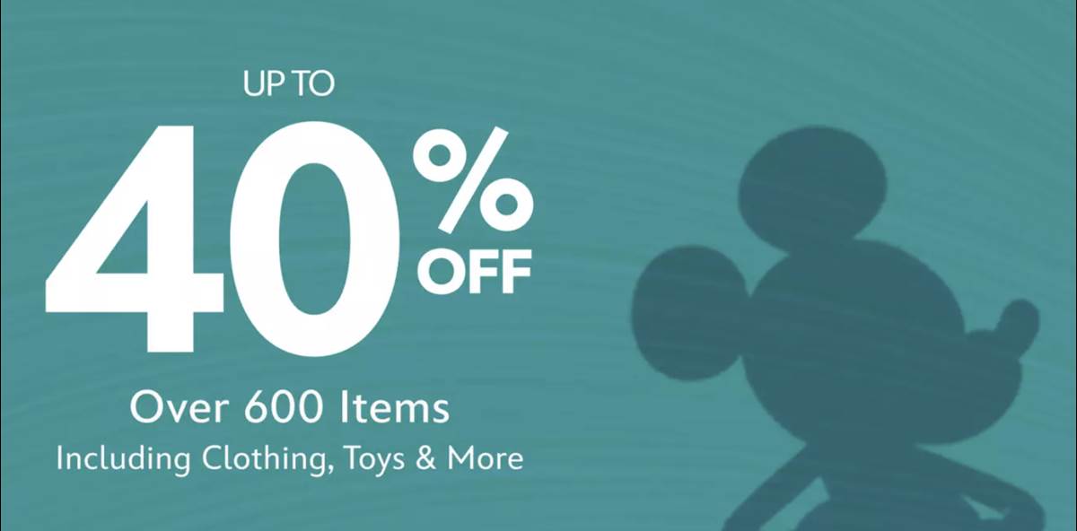 - Now through Sunday, August 20th guests can save up to 40% on a wide range of Disney essentials that are perfect for imaginative play and dress up, bedtime cuddles, or a group costume.