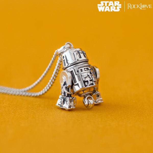 “Handcrafted in antiqued sterling silver and realistically sculpted in charming miniature, the intricately detailed three-dimensional Chopper droid inspired necklace includes three points of articulation, with riveted shoulders and a center spinning wheel."