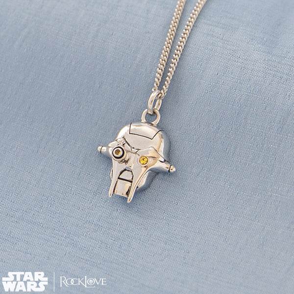 “Handcrafted in sterling silver with antiqued details, the Huyang pendant features the droid’s stoic visage, with signature articulated ‘lens’ that rotates down over his left eye. Both eyes feature golden glittering cubic zirconia crystals."