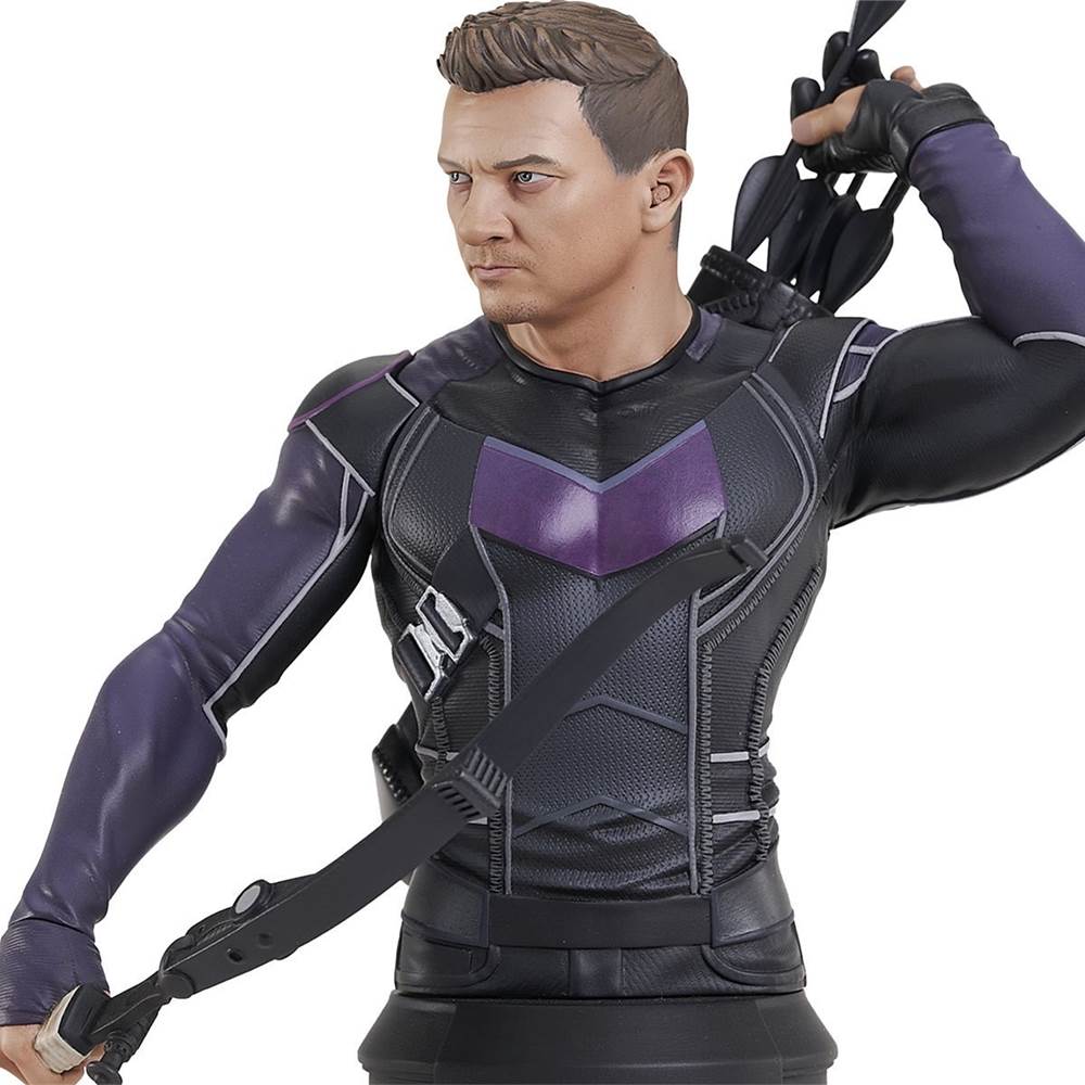 “The Avenging Archer has arrived in the Marvel movie-inspired line of mini-busts! Capturing Clint Barton as he pulls an arrow from his quiver, bow in hand, this 1:6 scale bust of Hawkeye stands atop a pedestal base."