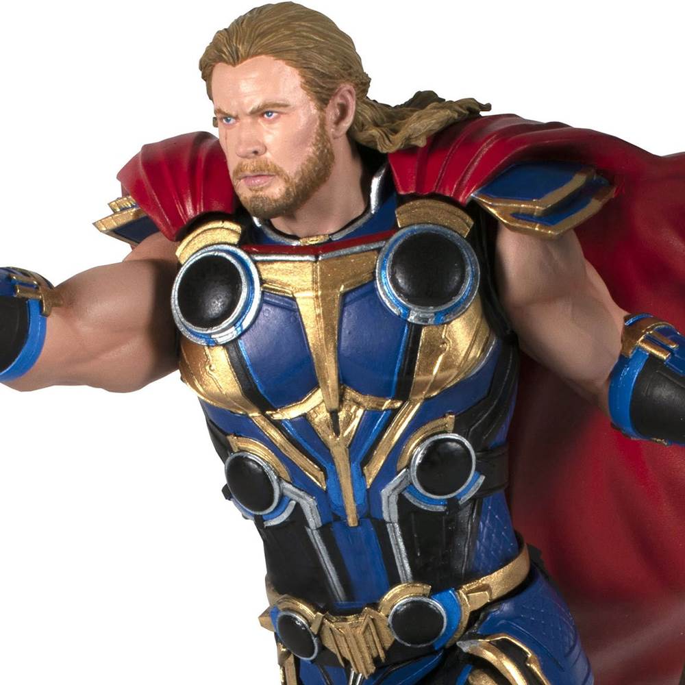 “Thor is back and he is bringing the thunder! Wearing his ornate armor as seen in Marvel's Thor: Love and Thunder, he sprints with his cape flaring and Stormbreaker in hand."
