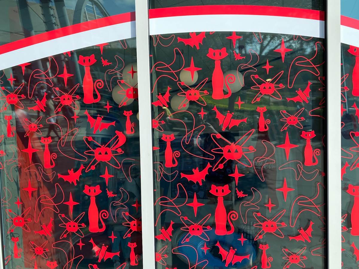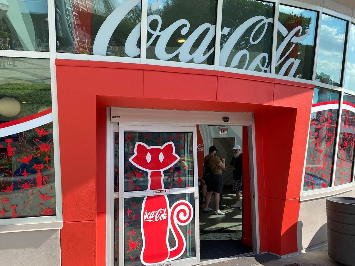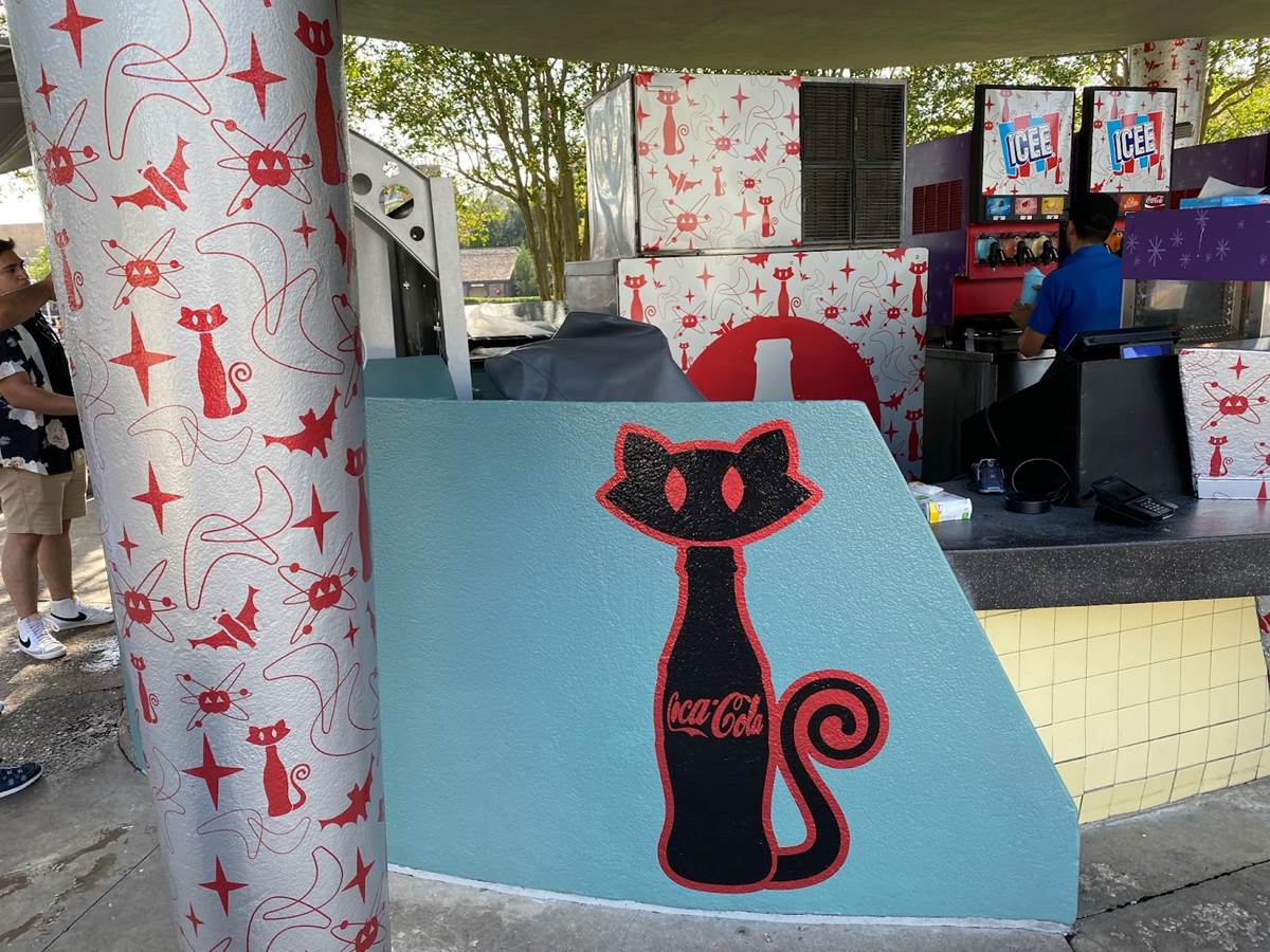 Two Coca-Cola beverage stands near Men in Black: Alien Attack have received some delightful cat-shaped Coke bottle decals, alongside other Halloween imagery.