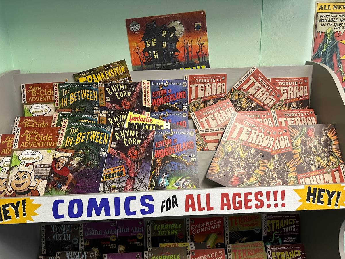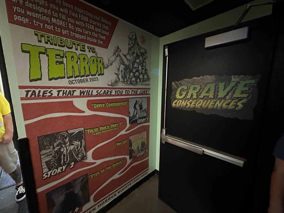 Each of the four rooms of the Tribute Store are themed to a different comic from the “Tribute to Terror" line. We first enter “Grave Consequences."