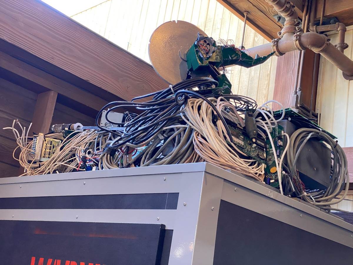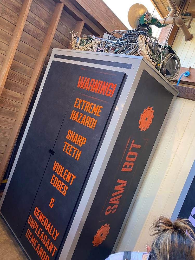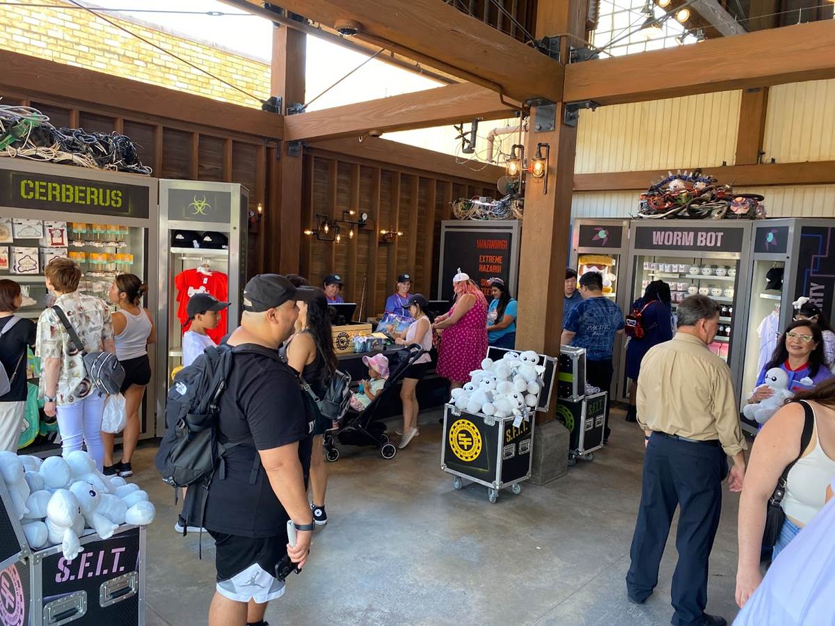 The market’s shelves are situated on robot storage cases, with decommissioned battle bots on display. If you turn a sharp eye to the rafters overhead, you may spot the local battlebot champion, Hiro’s Megabot!