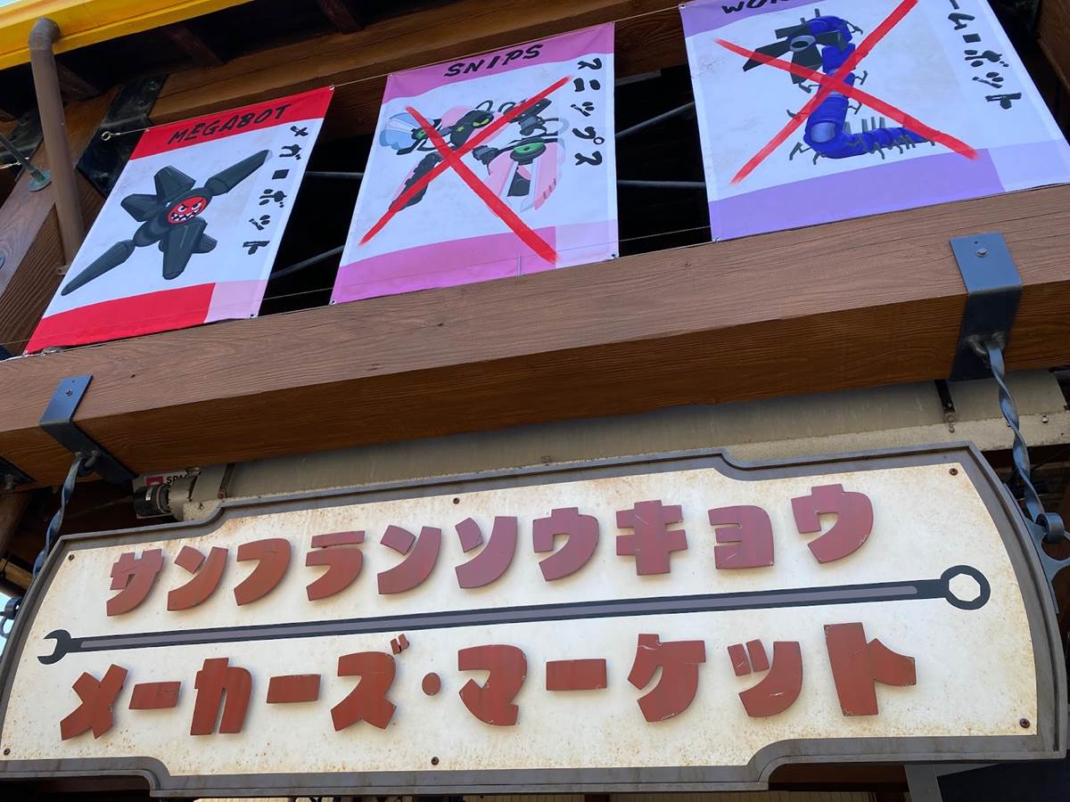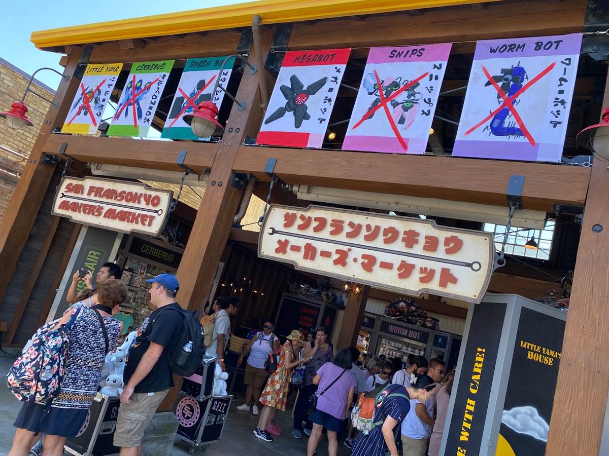 San Fransokyo Maker’s Market is a storefront stocked with unique apparel, homewares and more featuring Baymax and friends. Artwork of various designs that led up to the Megabot are displayed above the entrance signs, one in English and one in Japanese.