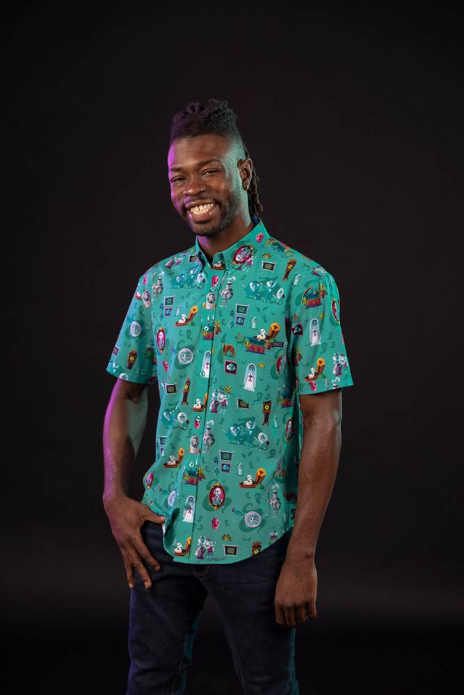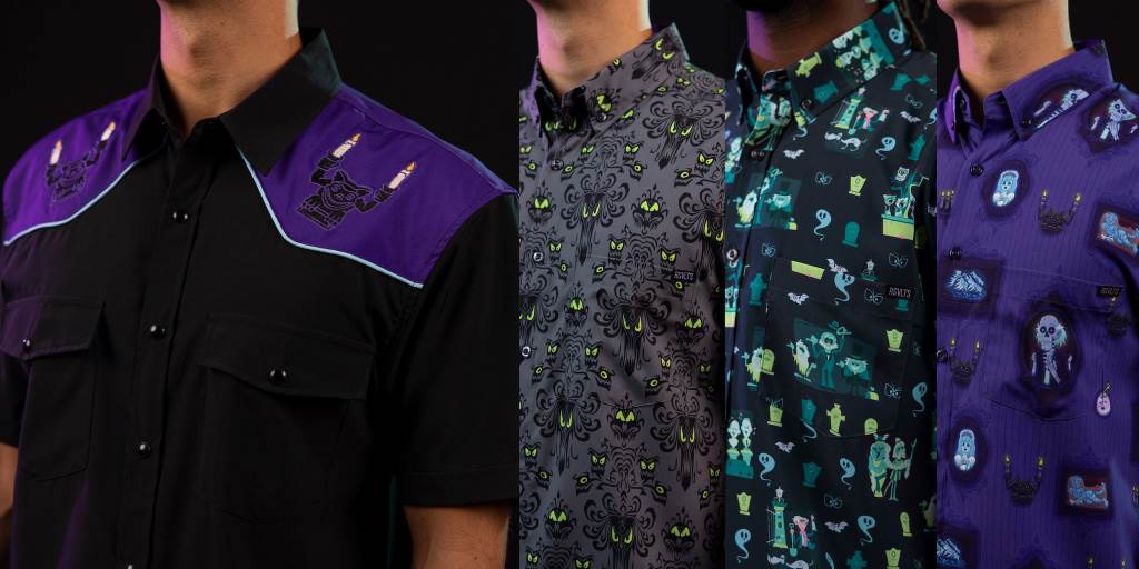- While this isn’t exactly an attraction-linear collection, we can make our way through the Mansion with these six styles starting with “Fright This Way." The gargoyle candelabras that set you off on your journey in the Stretching Room have taken up residence on a black and purple roper shirt and we gotta say, they look great.