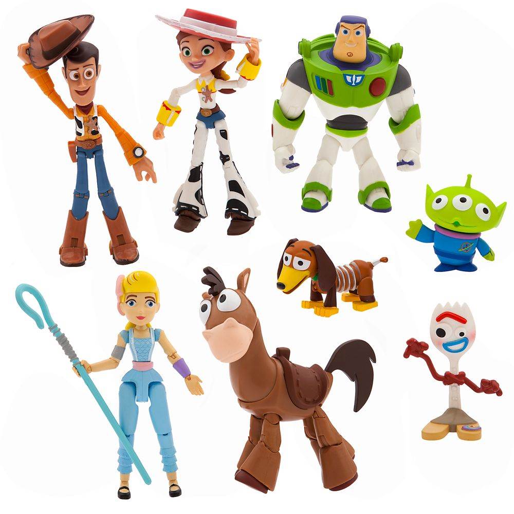 - Set includes eight poseable action figures: Buzz Lightyear, Woody, Jessie, Bullseye, Space Alien, Slinky Dog, Forky, and Bo Peep