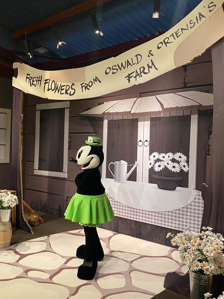 - The other half of the meet & greet featured Oswald the Lucky Rabbit, who switches off with his girlfriend, Ortensia. They appear in front of an “Oswald & Ortensia Farm" backdrop.