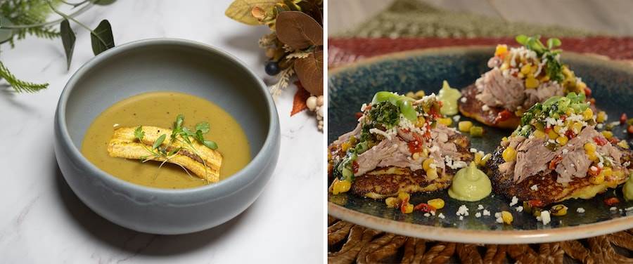 - Braised Pork Panceta al Pibil: Ají amarillo-sweet plantain purée, pickled peaches, and pipián verde (New)