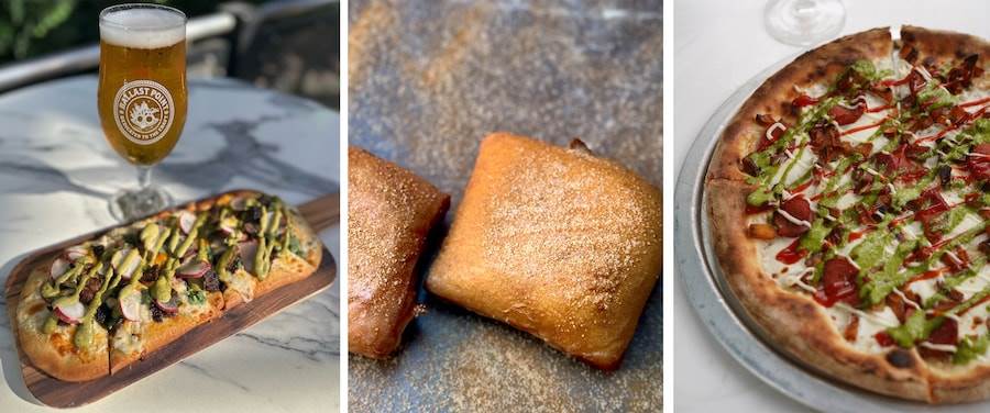 - Carne Asada Flatbread: Marinated skirt steak, roasted garlic cream sauce, mozzarella, and cheddar jack cheese garnished with a poblano salsa, shaved radish, and chopped cilantro (New)