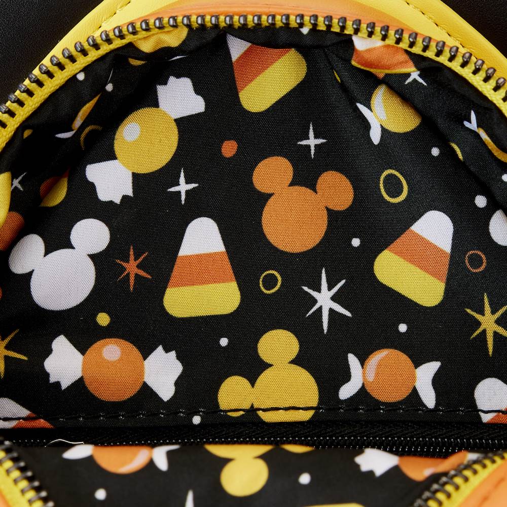 This reversible bag is shaped like a piece of candy corn, with classically colored stripes. In one view, Mickey Mouse’s face appears while the other side showcases Minnie Mouse complete with candy bow