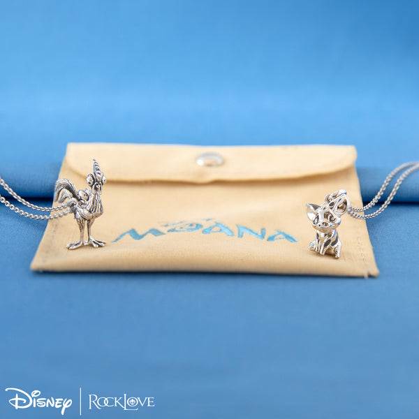 Moana’s animal friends join the RockLove collection and are handcrafted in polished sterling silver. Hei Hei is antiqued while Pua’s signature spotted markings are hand-painted in soft grey premium enamel. Each comes with an adjustable sterling silver cable chain with signature tag and graceful extender weight.