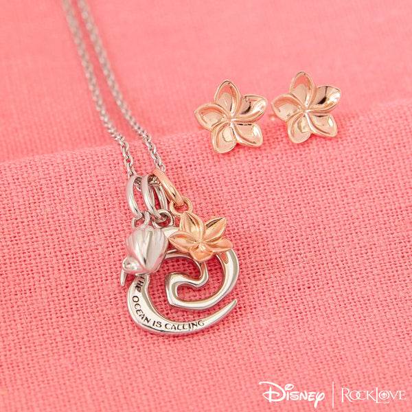 RockLove is diving back to the film’s opening where baby Moana discovers the ocean’s playful side! The necklace is handcrafted in sterling silver and includes three pendants: a petite conch shell, a plumeria blossom, and the whirling wave symbol. It’s also engraved with the words: “The ocean is calling." Like the plumeria charm, the stud earrings are sterling silver and plated in rose gold.