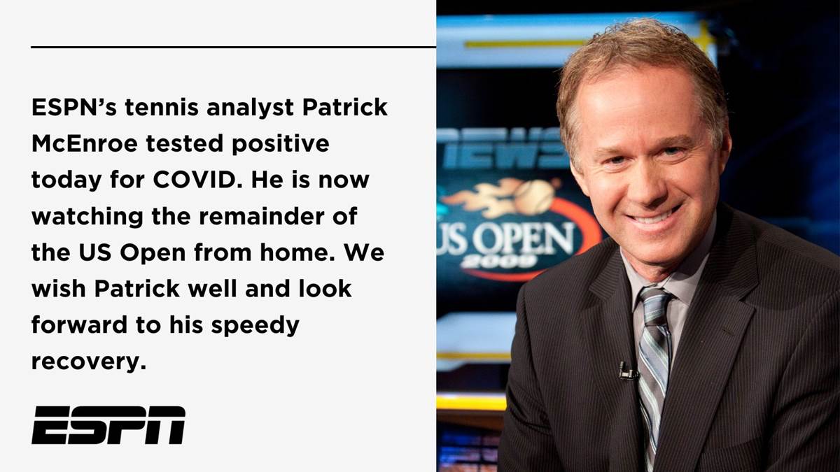 - “ESPN's tennis analyst Patrick McEnroe tested positive today for COVID. He is now watching the remainder of the US Open from home. We wish Patrick well and look forward to his speedy recovery."