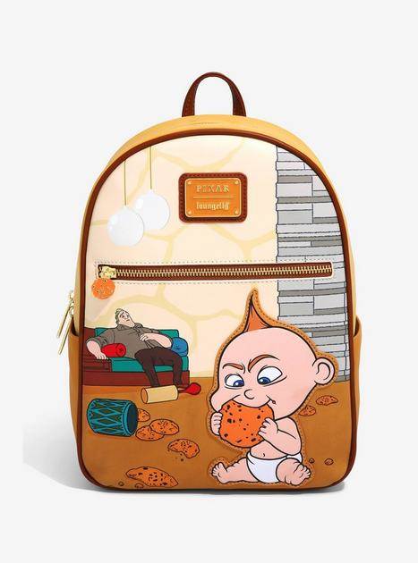 Another great Pixar find is this BoxLunch exclusive Loungefly mini backpack of super baby Jack-Jack enjoying a Num Num Cookie while exhausted dad, Mr. Incredible watches across the living room. Hey, if you had every power in the book, you’d be hungry for sugary goodness too!