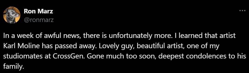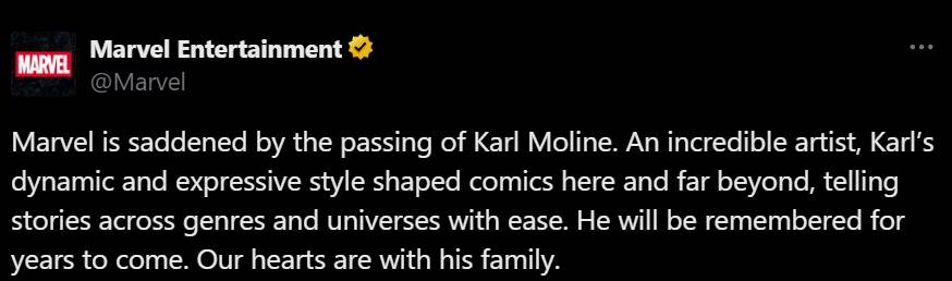 Additionally, Marvel tweeted their condolences. In an X post featuring his artwork with the comic company, the studio wrote “Marvel is saddened by the passing of Karl Moline. An incredible artist, Karl’s dynamic and expressive style shaped comics here and far beyond, telling stories across genres and universes with ease. He will be remembered for years to come. Our hearts are with his family."