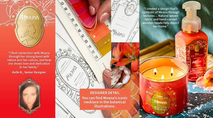 - Bath & Body Works’ Designer Detail notes that you can find Moana’s necklace in the botanical illustrations on their Moana-themed releases, including candles, fragrances, body wash, and more.