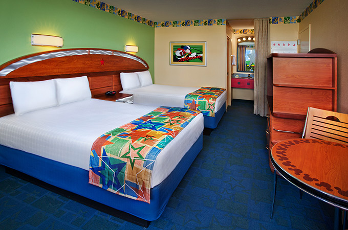 There are no Fitness Centers at any All Stars resorts, however guests may use one at another Disney resort for a $12 fee, based on availability. Standard room amenities: Alarm clock, mini fridge, hair dryer, ice bucket, in-room safe, iron and ironing board, pool towels, table & chairs, telephone with no surcharge (charges for long-distance will apply), television, vanity area, voice mail, Wi-Fi wireless internet