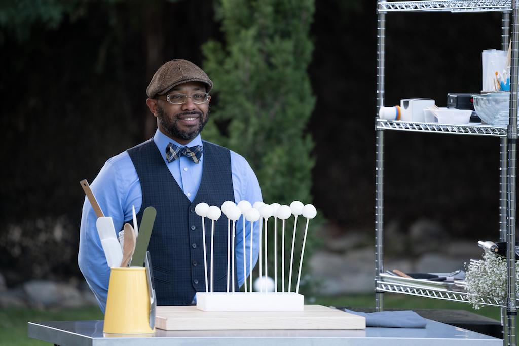 Baker’s Dozen -- “Mix and Mashup” - Episode 101 -- Contestants decorate cake pop bouquets. Only five make it to Round Two, where they bake their best delight and a mash up dessert to impress the judges including guest judge Joshua John Russell. Who will make it to the top three bakers and win the golden rolling pin? Tyrice Hayes, shown. (Photo by: Cory Osborne/Hulu)