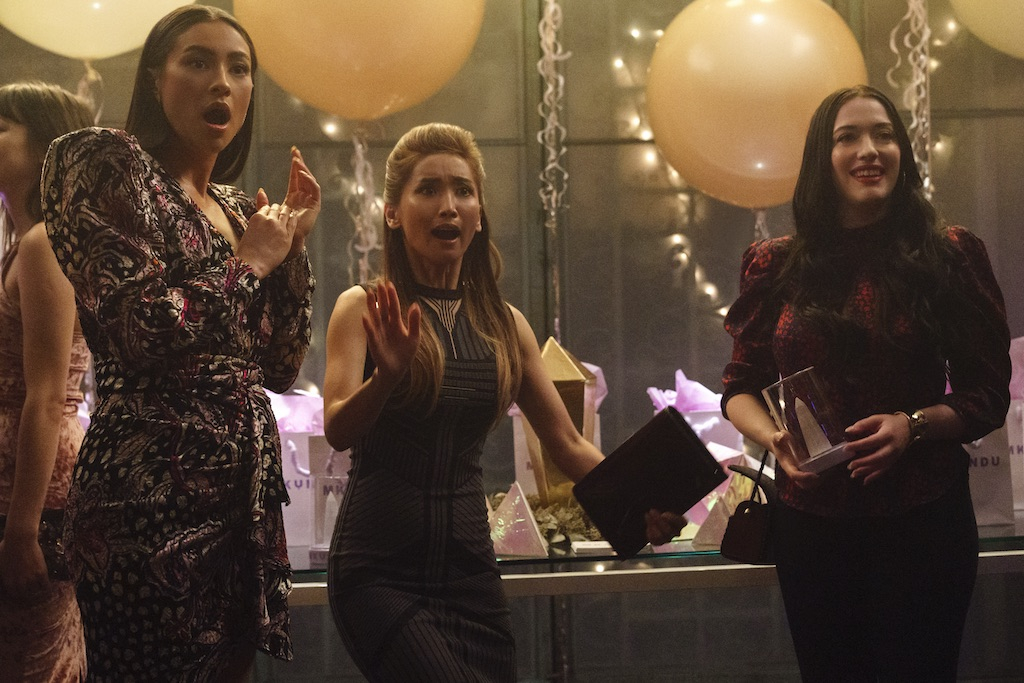 Dollface -- "Homebody" - Episode 102 -- Jules goes to her girlfriends for advice about moving out of her ex’s place, but finds navigating which friend’s advice to take an even more complicated problem. Stella (Shay Mitchell) and Madison (Brenda Song), shown. (Photo by: Ali Goldstein/Hulu)