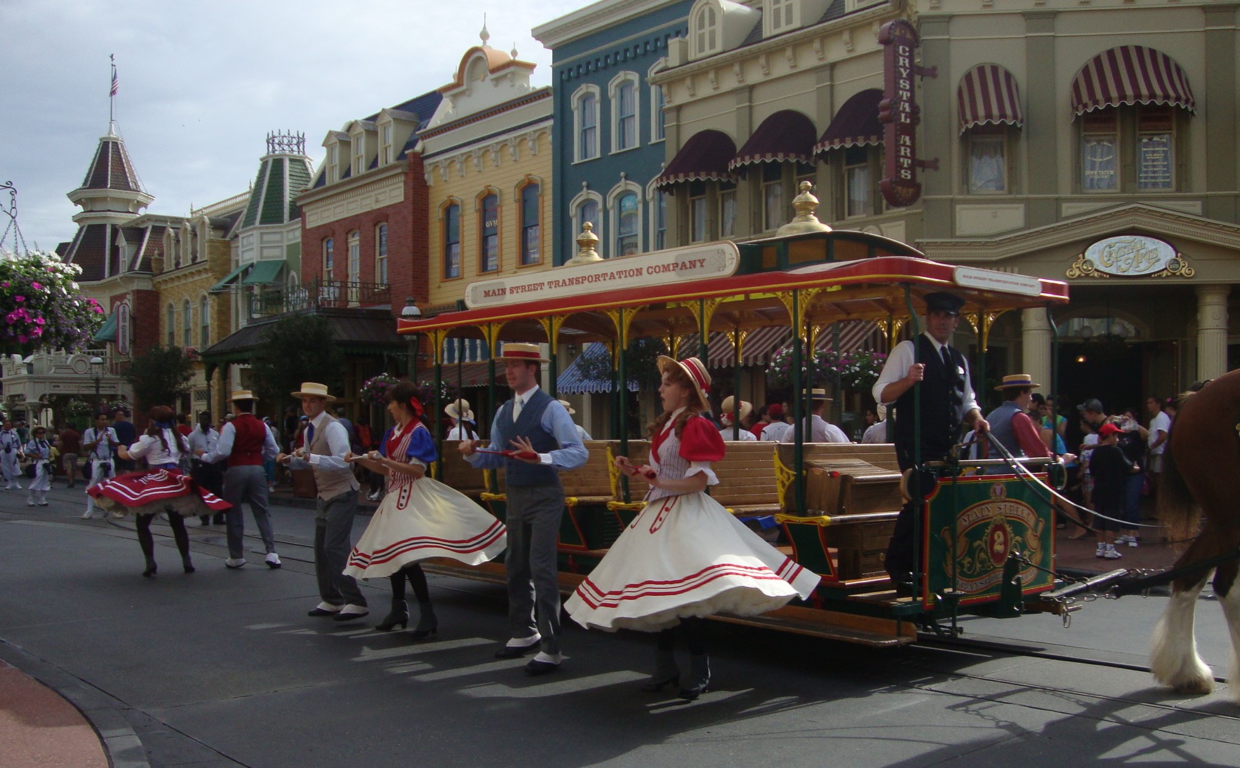 The trolley show routinely rolls through Main Street during the morning. Playing some of the most enthusiastic songs in the Disney library, this show never fails to entertain.