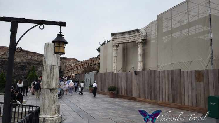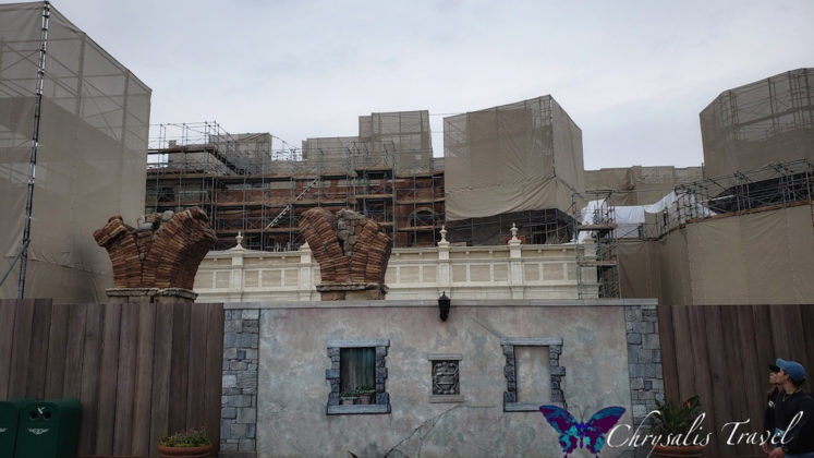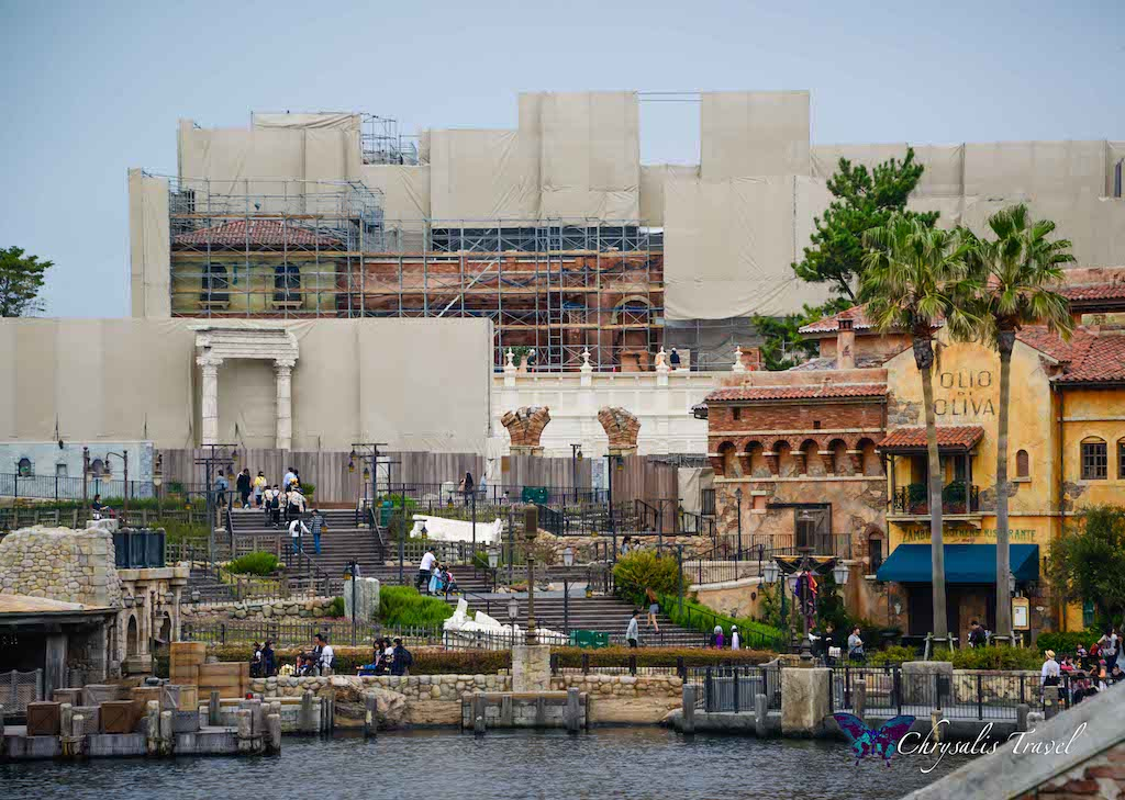 The attraction has a beautiful Italian-style façade that can be seen across Mediterranean Harbor. On a Fall 2018 trip Laughing Place featured author Gloria Hasler captured some photo of the scaffolding to coming down, revealing the detailed brick work of the ride building.