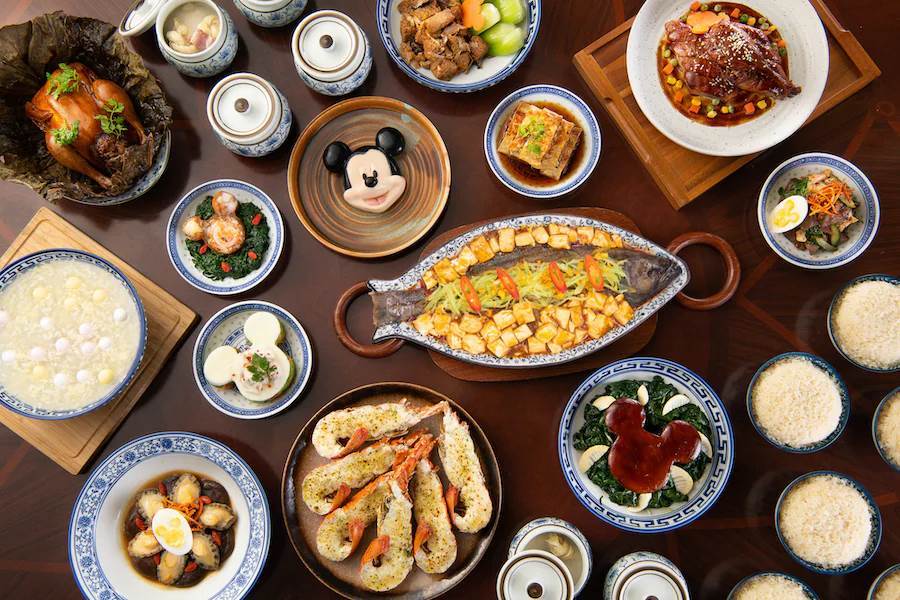 • Spring Festival Family Feast: Mickey-shaped braised pork belly, steamed chicken stuffed with glutinous rice and vegetable, and steamed fish with tofu