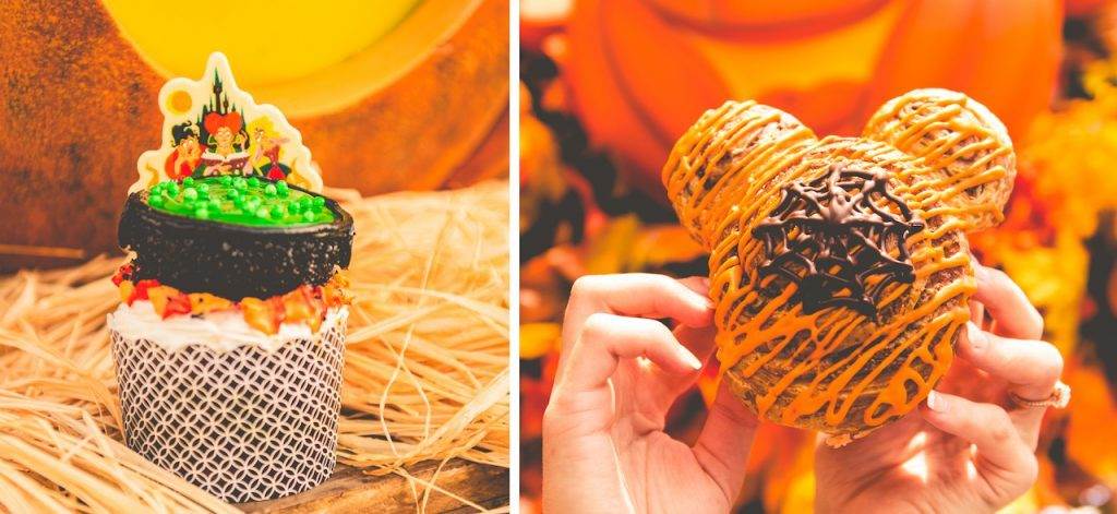 • Trick or treat candy cupcake (a cupcake baked peanut butter chips, chocolate candy bits, and toffee) filled with caramel sauce, topped with an edible cake “cauldron," and chocolate buttercream and garnished with a white chocolate decoration featuring the Sanderson sisters.