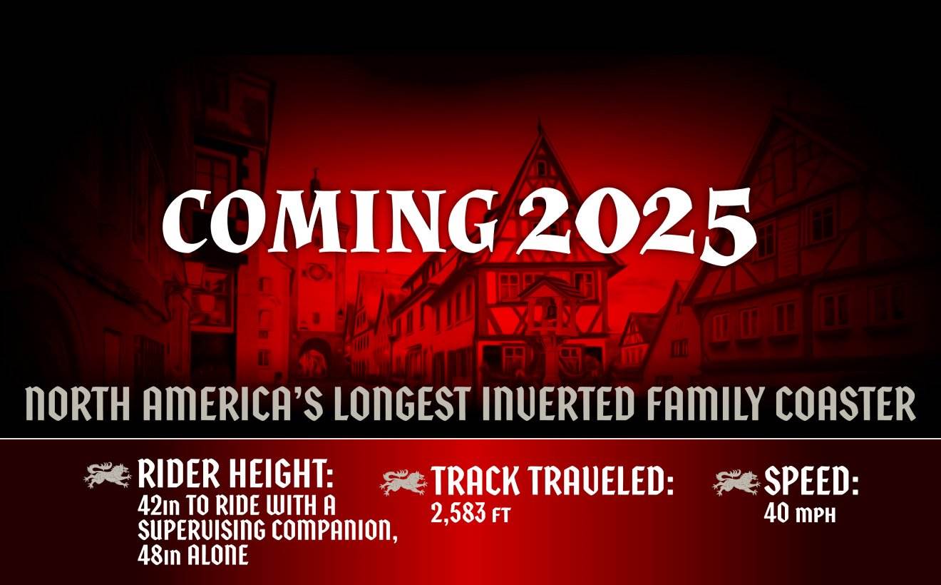- Riders will travel over 2,500 feet of track at speeds of up to 40 miles per hour, all while bolting through the streets of an abandoned Bavarian village on this family-friendly inverted coaster.