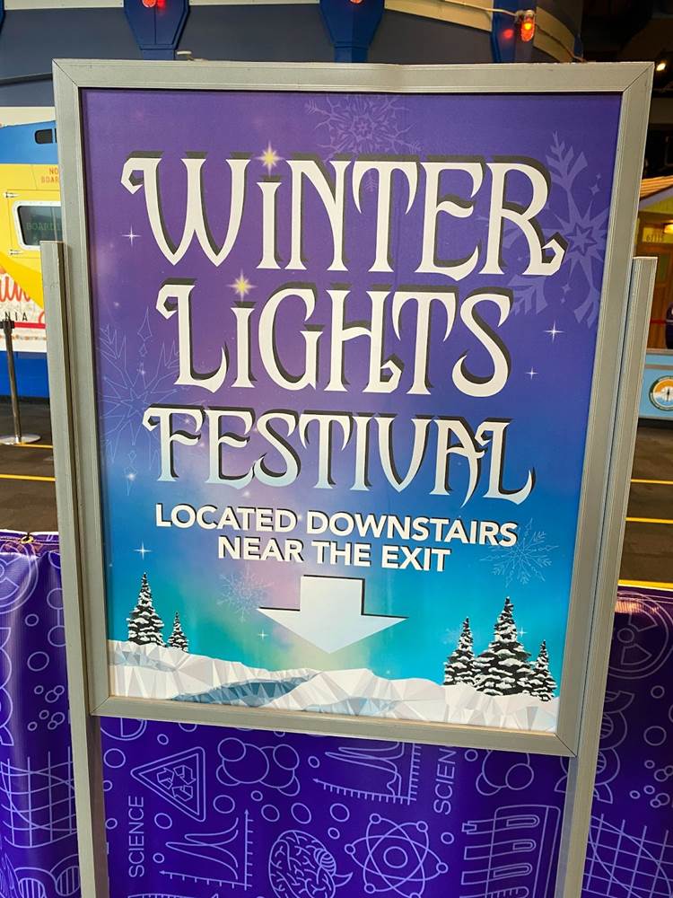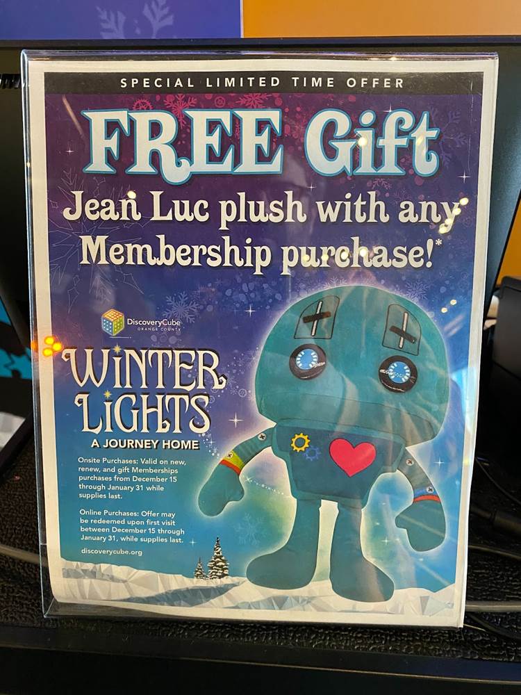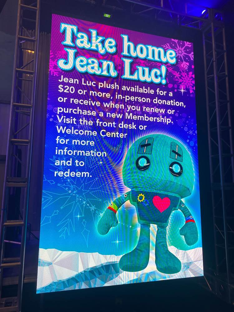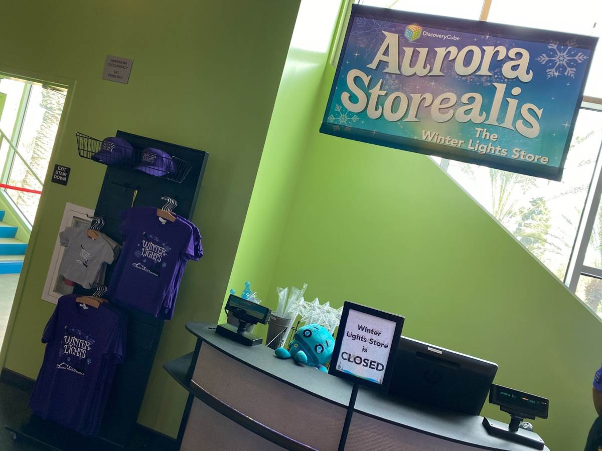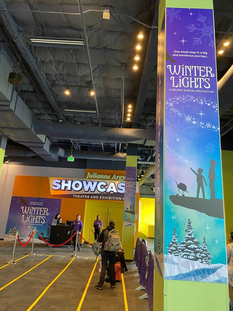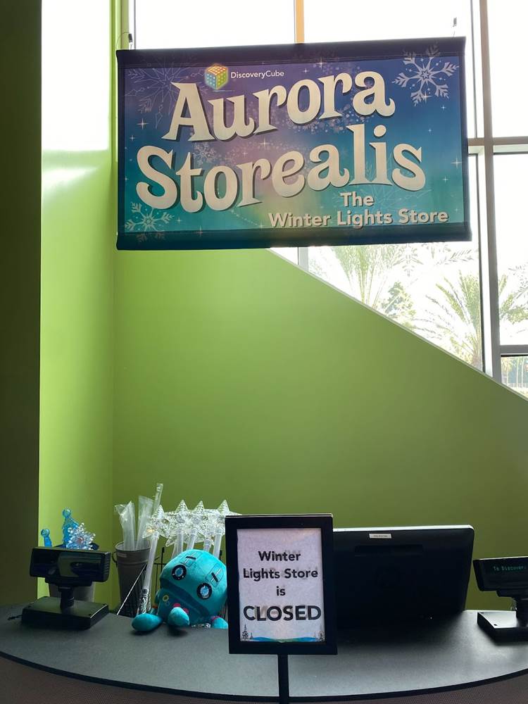 Below you can see photos of our approach to the Discovery Cube, the exterior of the building, the interior decor for the holiday season, and the area surrounding the Julianne Argyros Showcase theater. There’s also a small gift shop called “Aurora Storealis" where guests can pick up merchandise from the “Winter Lights" show and a cute little plush of Jean Luc.