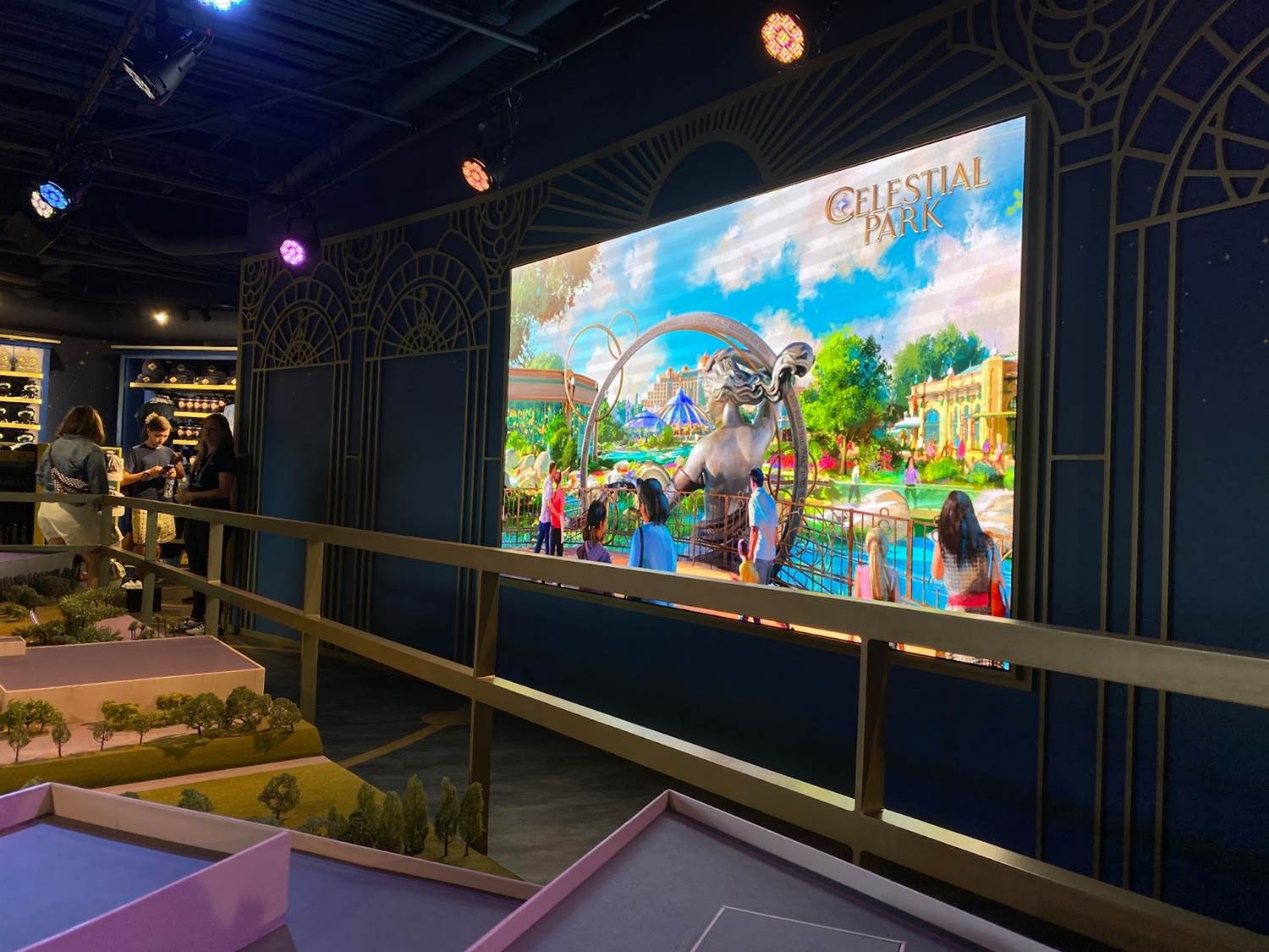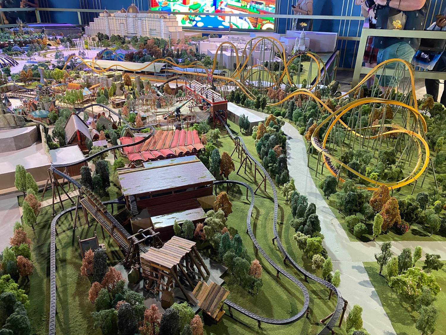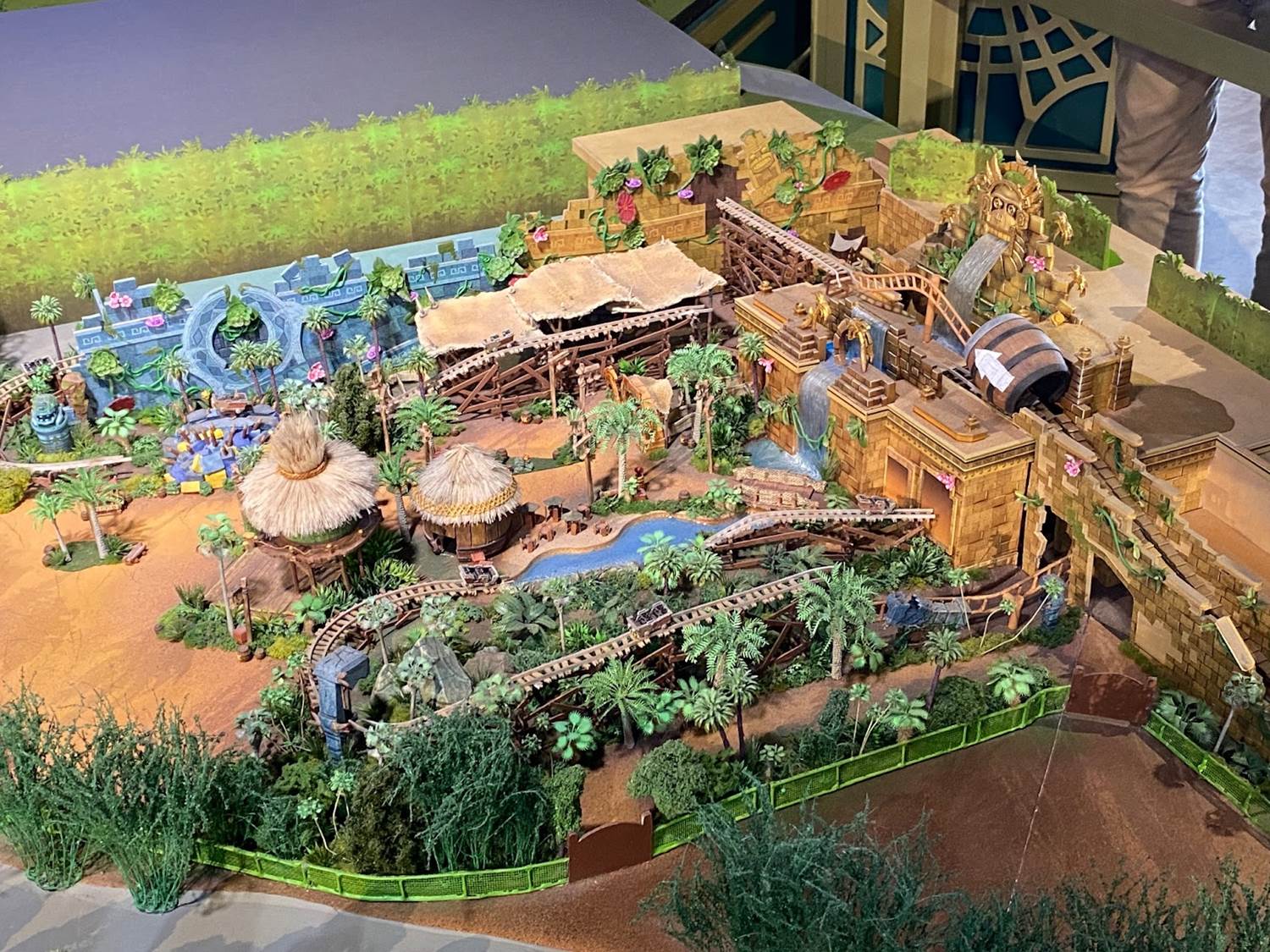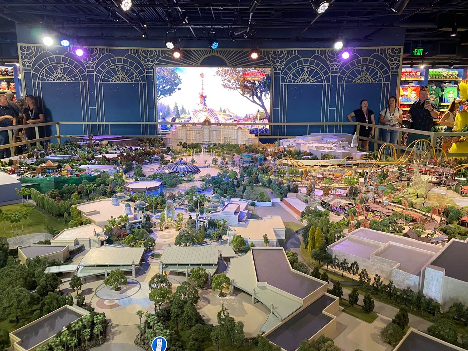 Behind the model, a screen rotates through various concept images of each area of the park.