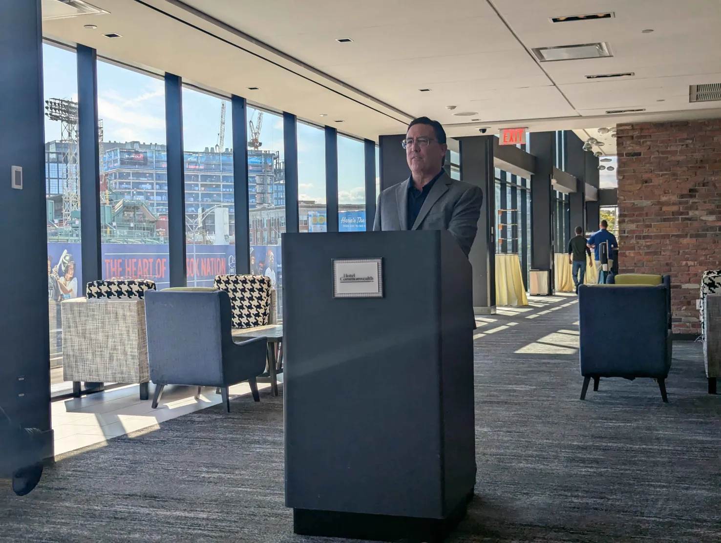 We met at the hotel’s Fenway Foyer at 3 p.m. for our Welcome Reception. Mike welcomed everyone — including our first special guest, Dave O’ Brien. In addition to doing play-by-play for ESPN’s ACC Network, he is also the play-by-play announcer for Red Sox telecasts. Dave shared what a special experience he felt this would be for all of us. He also shared his own personal history with the Red Sox including visiting the ballpark with his dad and brothers. He also previewed some of the Fenway Park history that we would be learning more about. I am a huge fan of Mr. O’Brien’s work and he was very generous with his time despite his other duties, including it being his daughter’s 30th birthday. He was happy to pose for pictures or sign autographs. After the welcome remarks we could enjoy some beverages, including adult options, and some snacks.