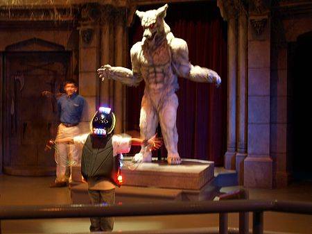 The next room of the show was the Creature Factory, where there were tons of different monsters and villains scattered around the stage. This portion of the show was pretty much lifted directly from the Horror Makeup Show at Universal Studios Florida, with almost every element of this ten minute segment originating there (though it was not quite as funny as its Floridian counterpart). The segment begins with a clip show of classic Universal monsters before moving into the classic gag where our intrepid hosts pretend to cut off the arm of a volunteer, complete with gushing blood from the fake knife. Our lovely volunteer who had “died" in the first room was then returned to us but more tragedy was on the agenda when a child volunteer was brought on stage to help demonstrate how mocap works on a giant, scary werewolf. After the seemingly harmless demo, the werewolf came to life and chased the host around the stage, ultimately ending her life and leading the assistant to hurriedly move us into the next room. (That werewolf scene scared me so much as a kid that I basically refused to ever see the show again because I didn’t want to be eaten.)