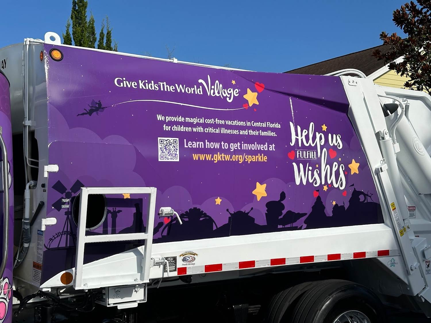 This morning, Give Kids The World Village unveiled Celebration Sanitation Services’ most magical sanitation truck – a truck wrapped with the brightly-colored storybook designs and whimsical branding of Give Kids The World Village.