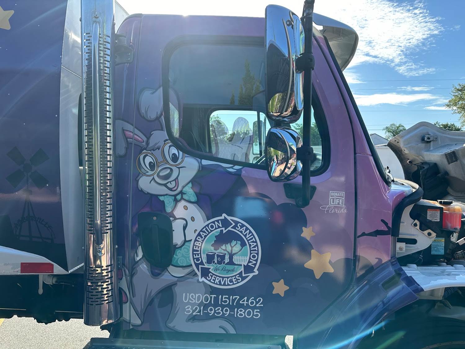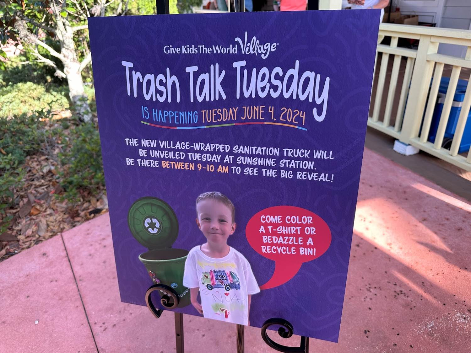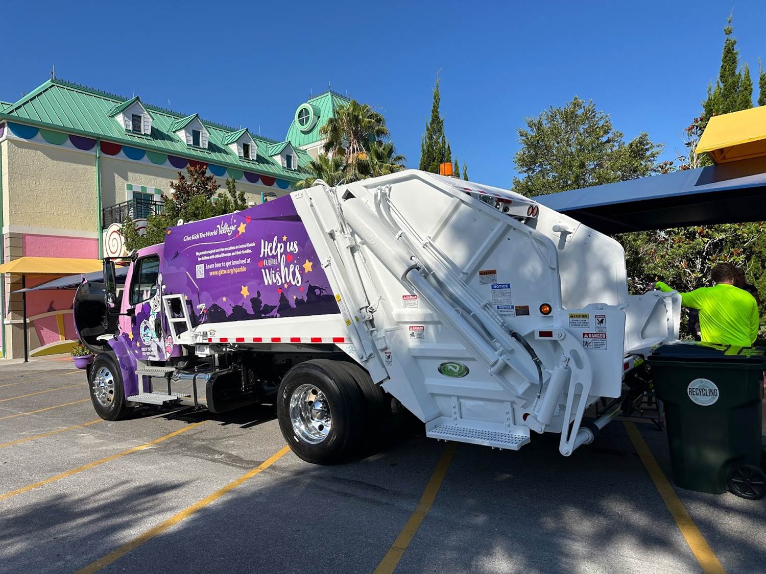 Designed to generate awareness and support for Give Kids The World, the truck wrapping is part of Trash Talk Tuesday, a fun, hands-on experience in which Celebration Sanitation Services trucks visit the Village each week to educate wish children and families about recycling and provide memorable trash truck experiences such as working the levers to dump recycling cans into the truck. Other activities include color-the-trash-truck t-shirts and more.