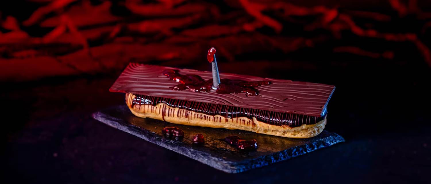 - Wooden Board Eclair - spicy dark chocolate pastry cream filled eclair dipped in chocolate ganache with a chocolate “plank" (Vegetarian)