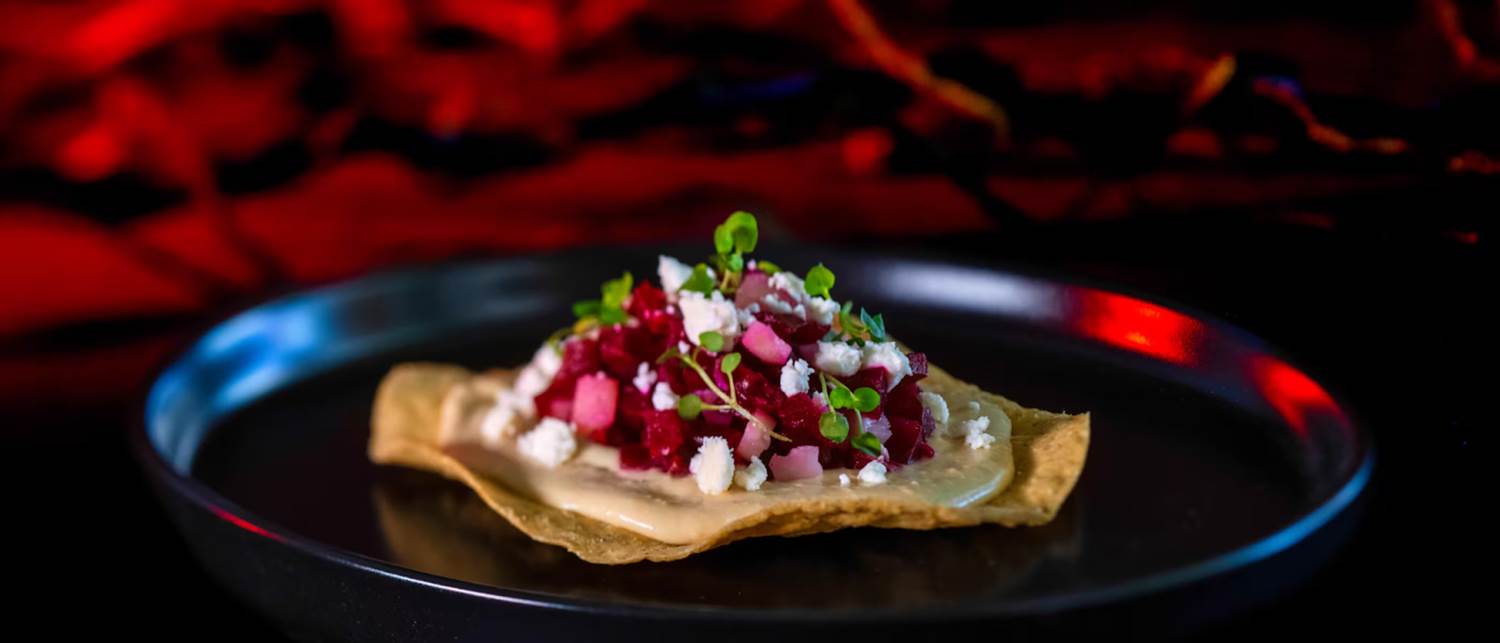 - Heart Beet Tostada - red beet tartare with hummus, vegan feta, and watercress on a crispy tortilla (vegan)