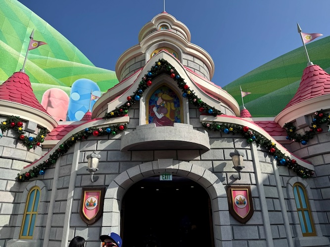 Once exciting Peach’s Castle, guests will see the facade adorned with themed garland and wreaths, which can also be found over at the character’s meet and greet location.