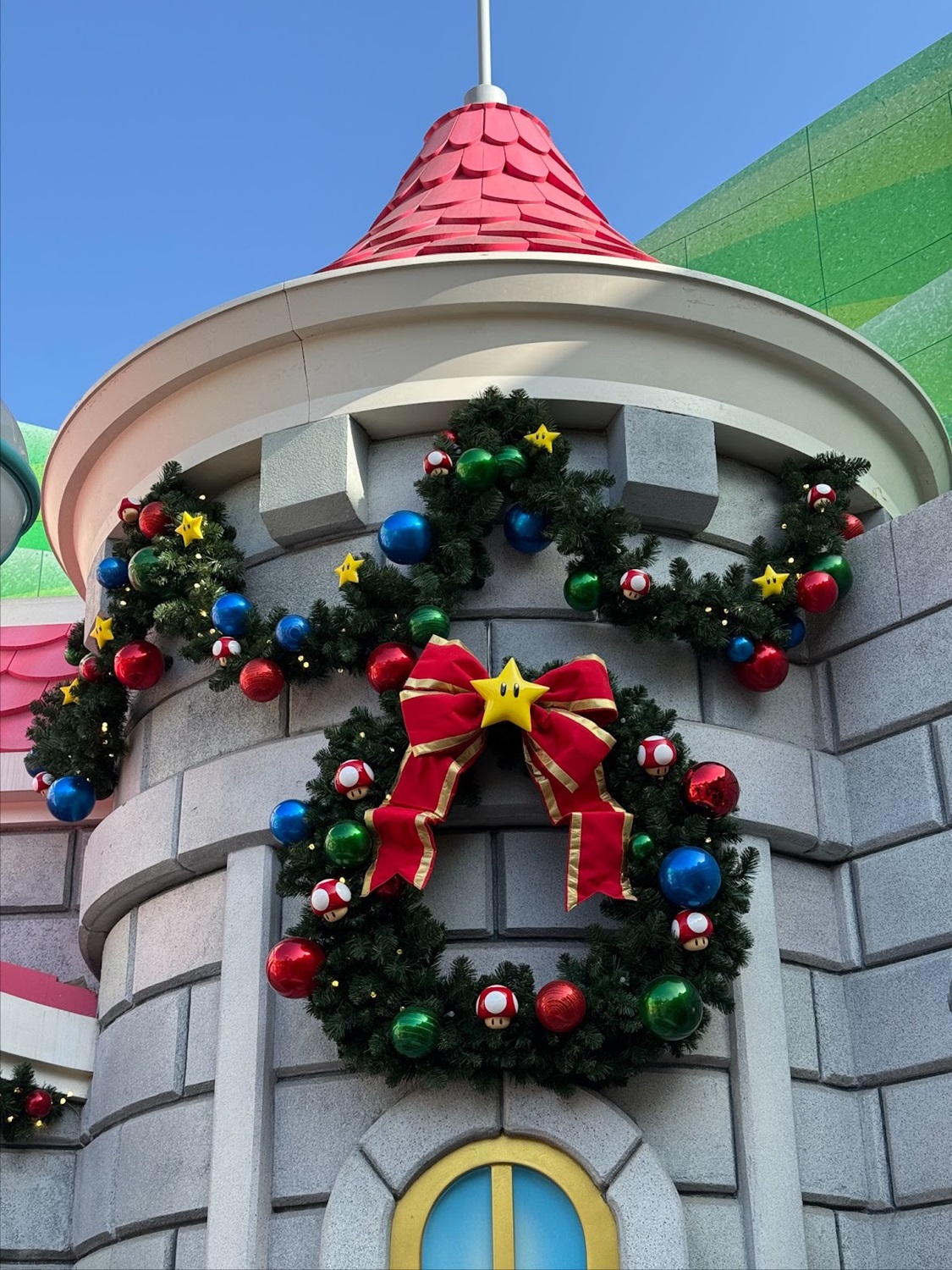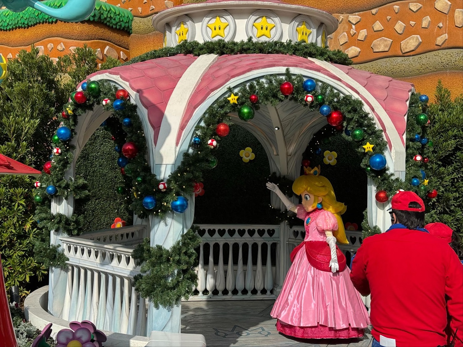 Once exciting Peach’s Castle, guests will see the facade adorned with themed garland and wreaths, which can also be found over at the character’s meet and greet location.