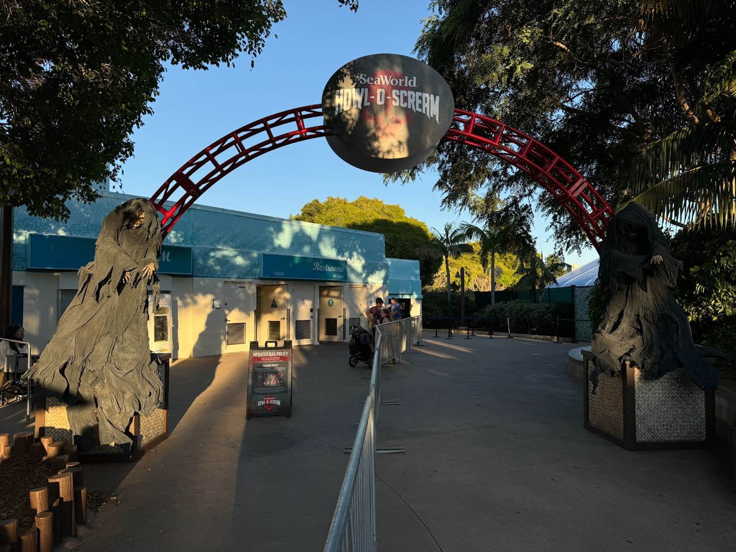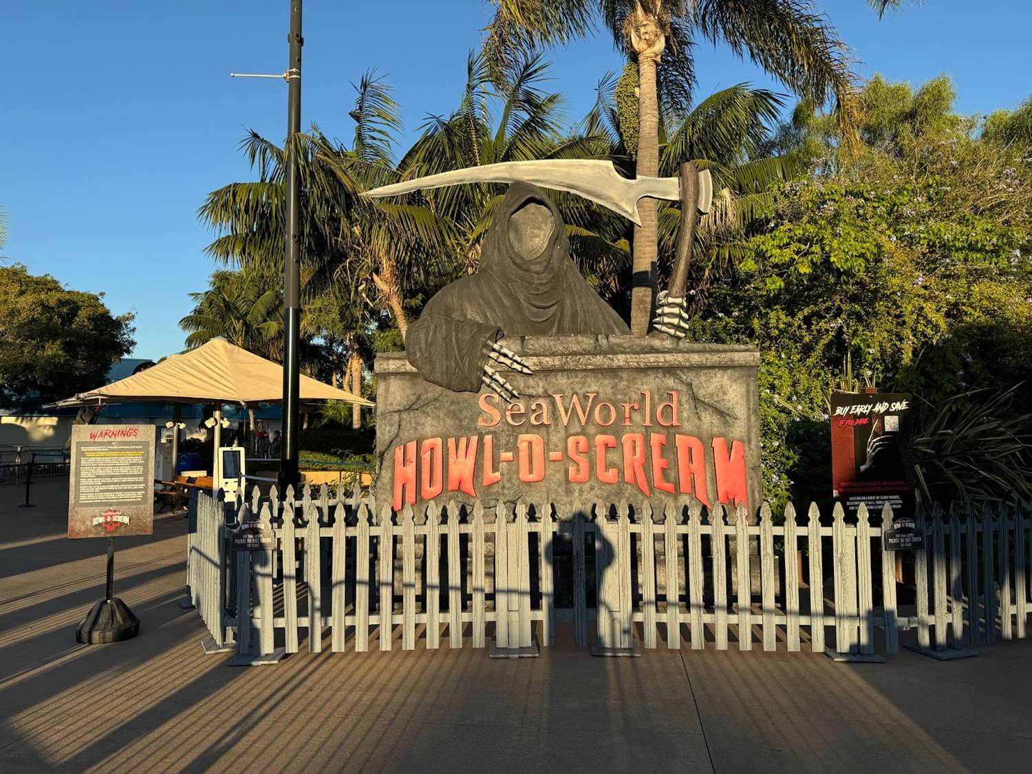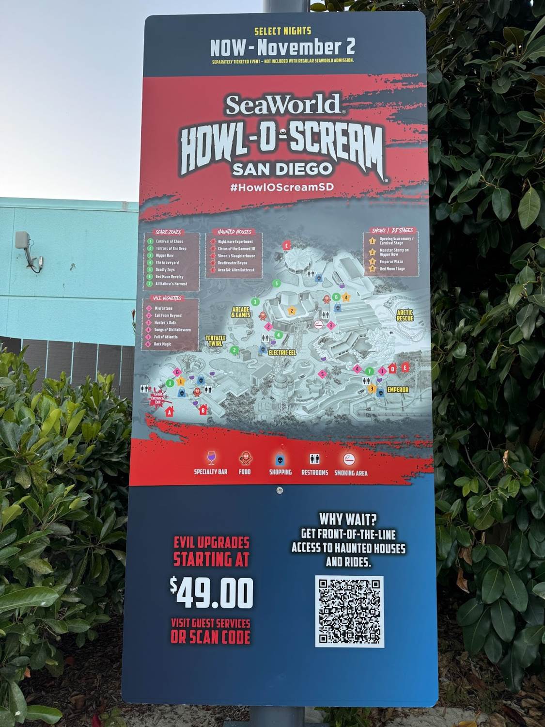 Rewinding time a bit, when we first arrived at SeaWorld San Diego we found the park decked out for the Halloween season and ready for a night full of scares, with helpful signage providing showtimes and a map of the haunt.