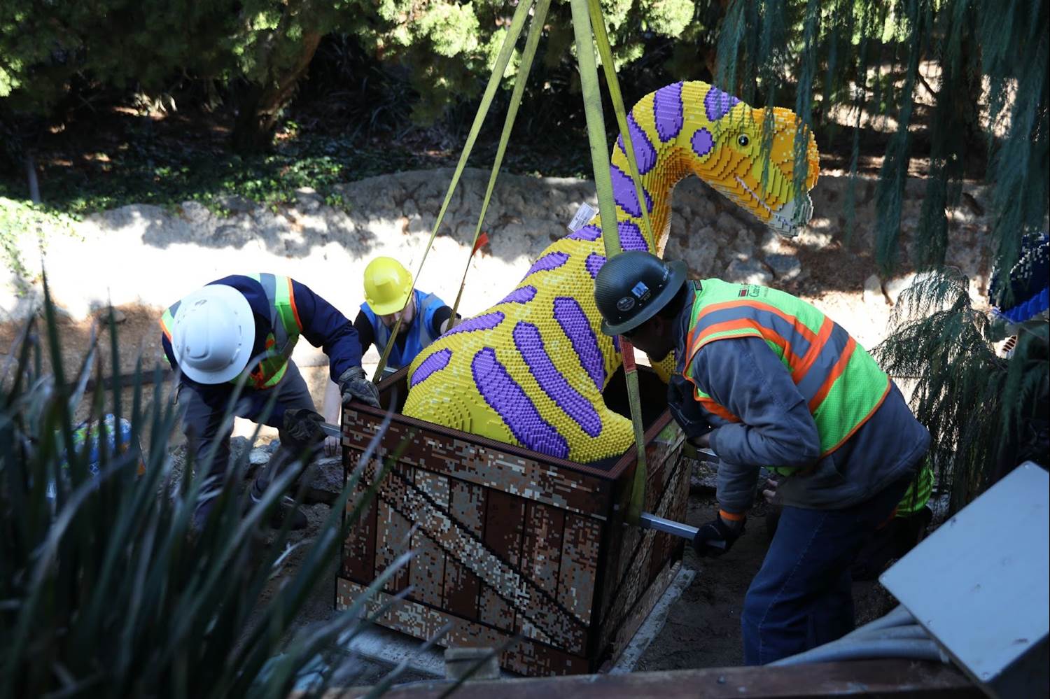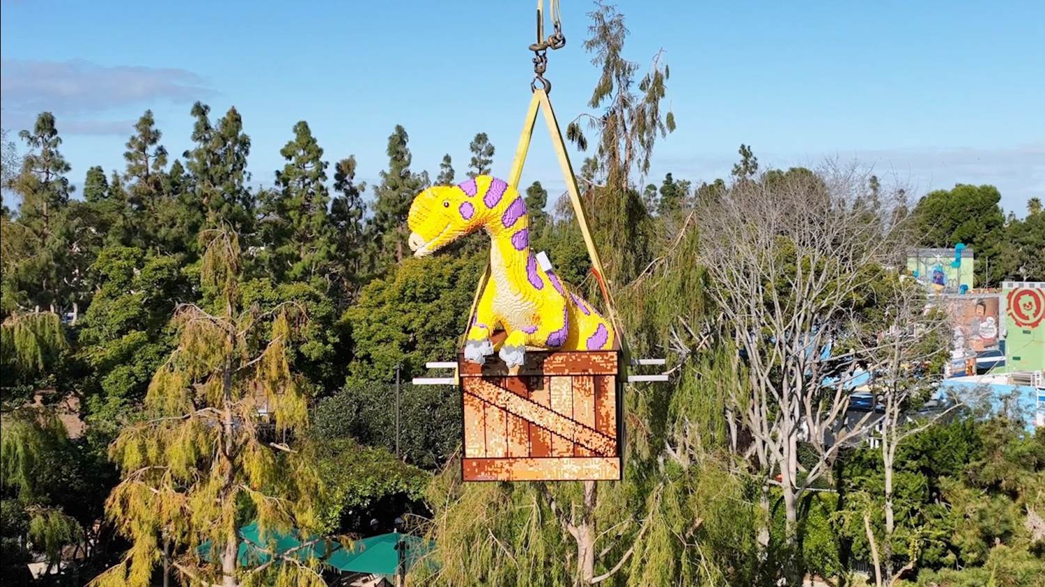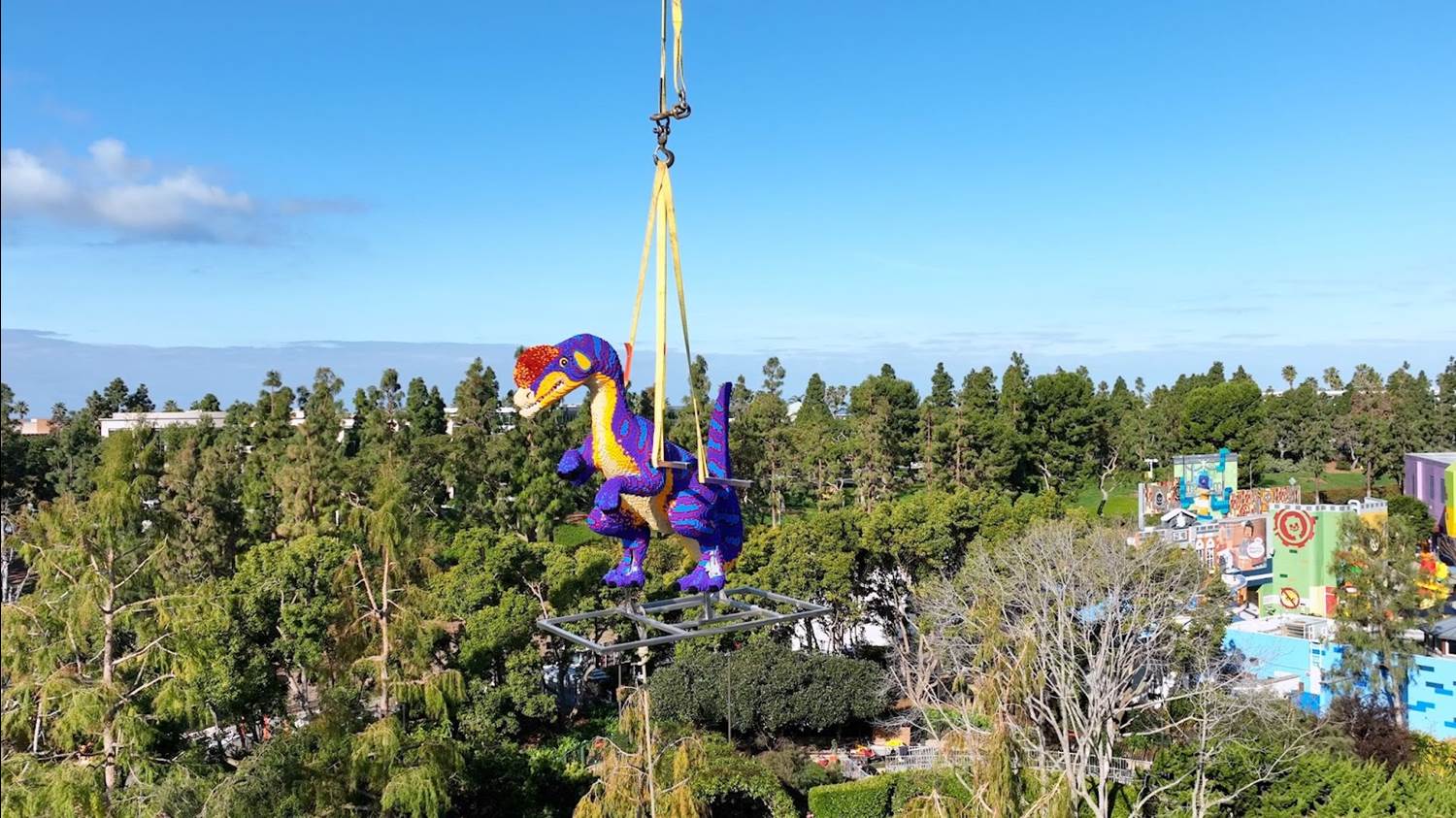 Four LEGO dinosaurs including a Dilophosaurus and a Stegosaurus literally took flight over LEGOLAND California Resort as they were craned into the family theme park’s new land, Dino Valley, set to open this spring.