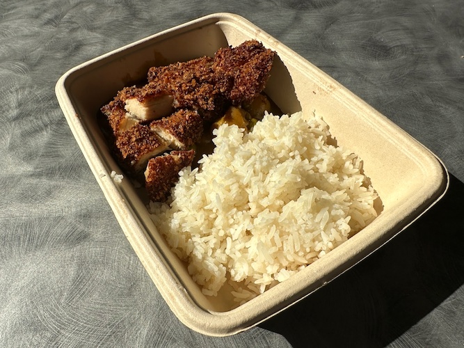 - Crispy panko-breaded chicken paired with rich Japanese curry, hearty potatoes, carrots, and peas, all served on jasmine rice