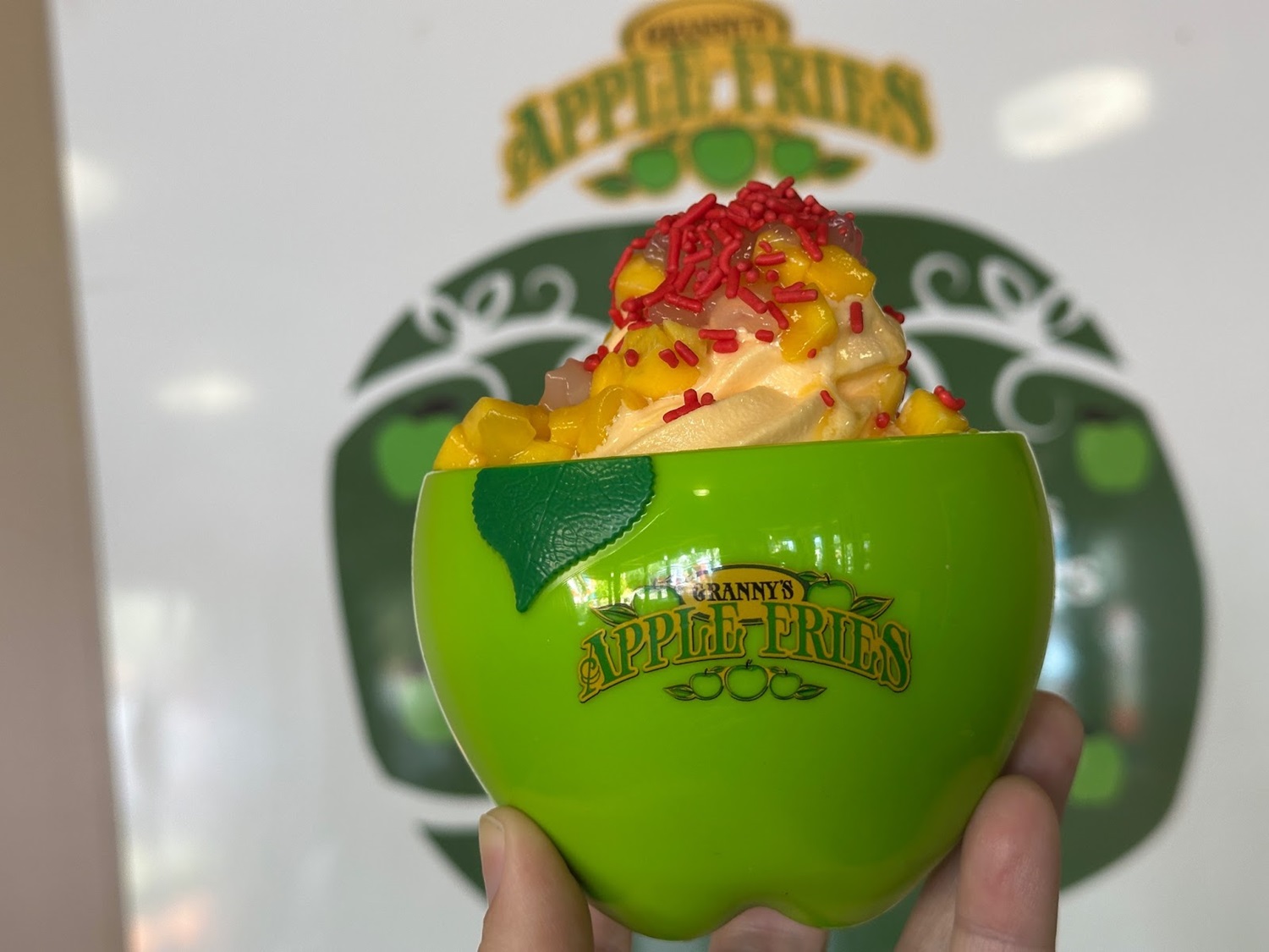 - Granny's signature Apple Fries crowned with mango ice cream, mango chunks, sprinkles, and lychee jelly stars
