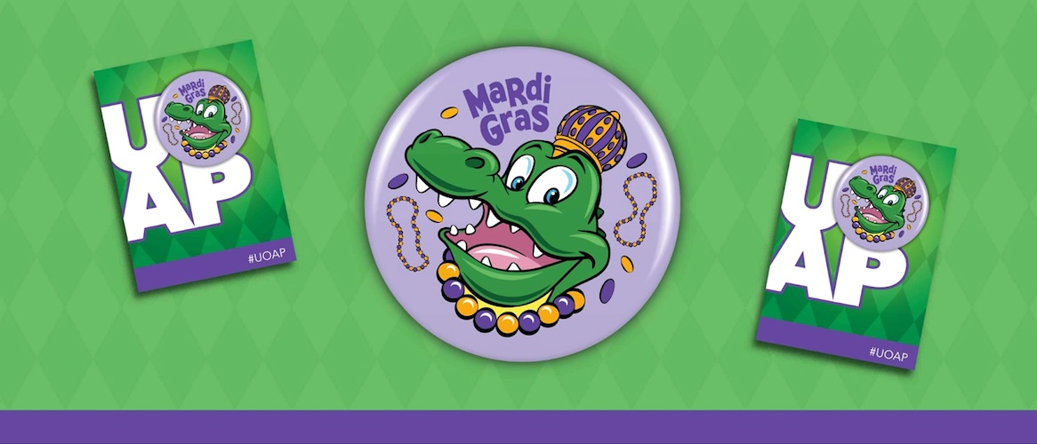 - Passholder-Exclusive Mardi Gras Button: All hail King Gator! Let the good times roll with a UOAP Exclusive Mardi Gras Button featuring the king of the swamp. Passholders can pick up one free button at the following locations, while supplies last: