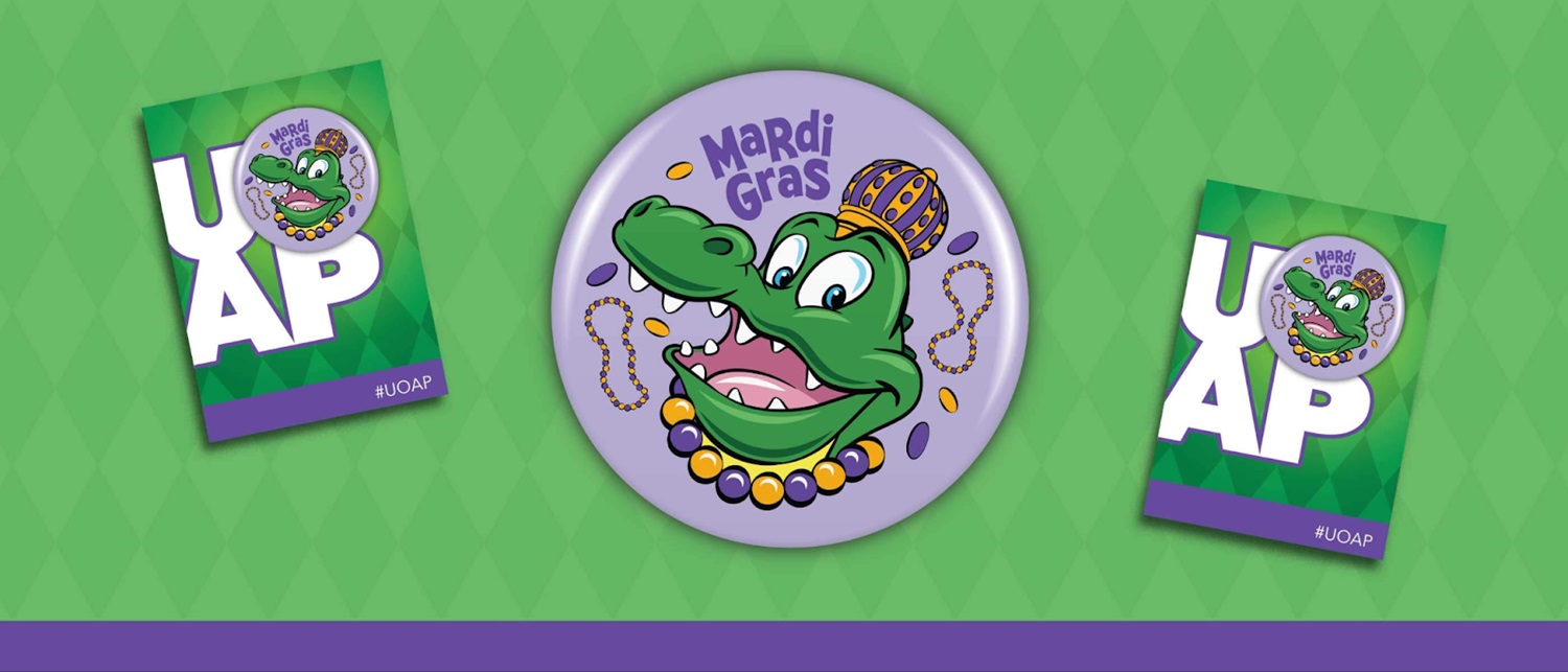 - Passholder-Exclusive Mardi Gras Button: All hail King Gator! Let the good times roll with a UOAP Exclusive Mardi Gras Button featuring the king of the swamp. Passholders can pick up one free button at the following locations, while supplies last:
