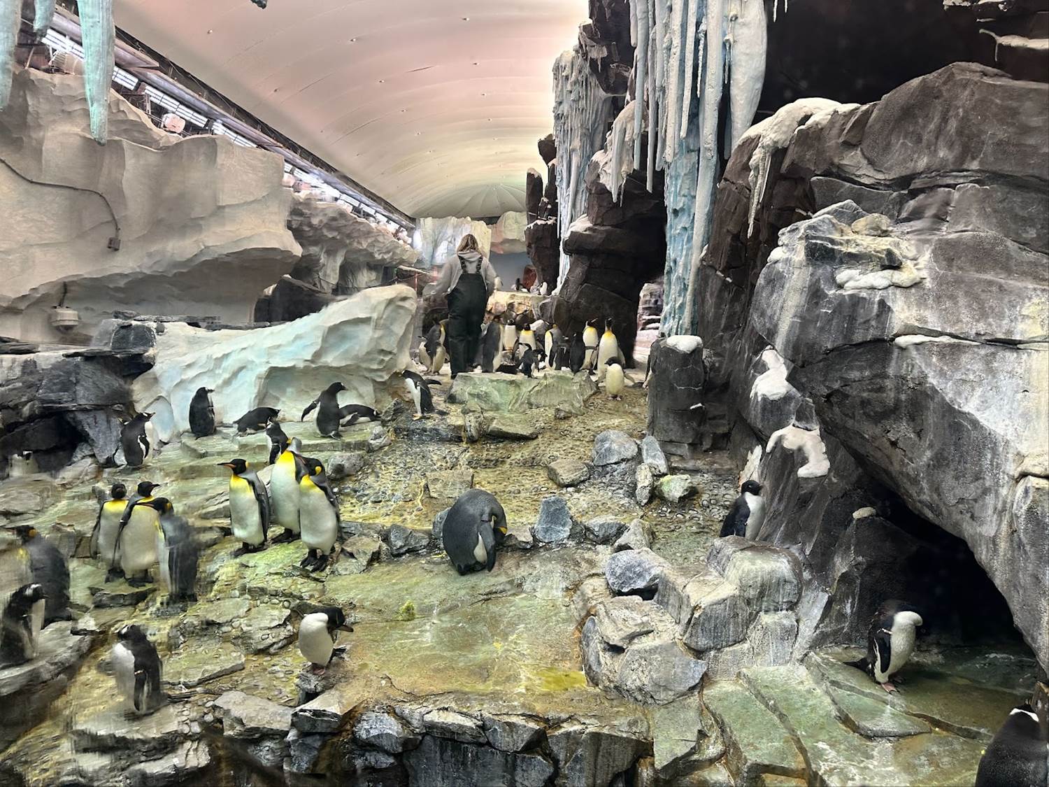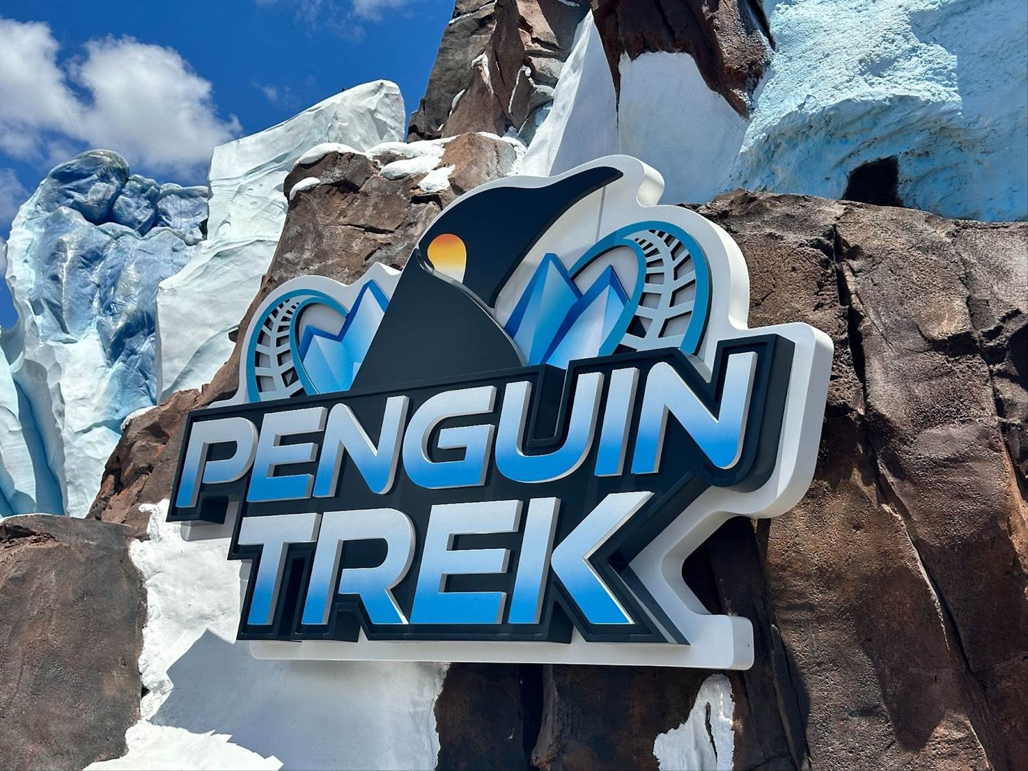 - Penguin Trek invites families to board snow-mobile themed trains as a part of a research mission. Riders will encounter crumbling ice caverns, twists and turns, and launches up to 43 miles per hour. At the end of the experience, guests will exit into the indoor penguin habitat.