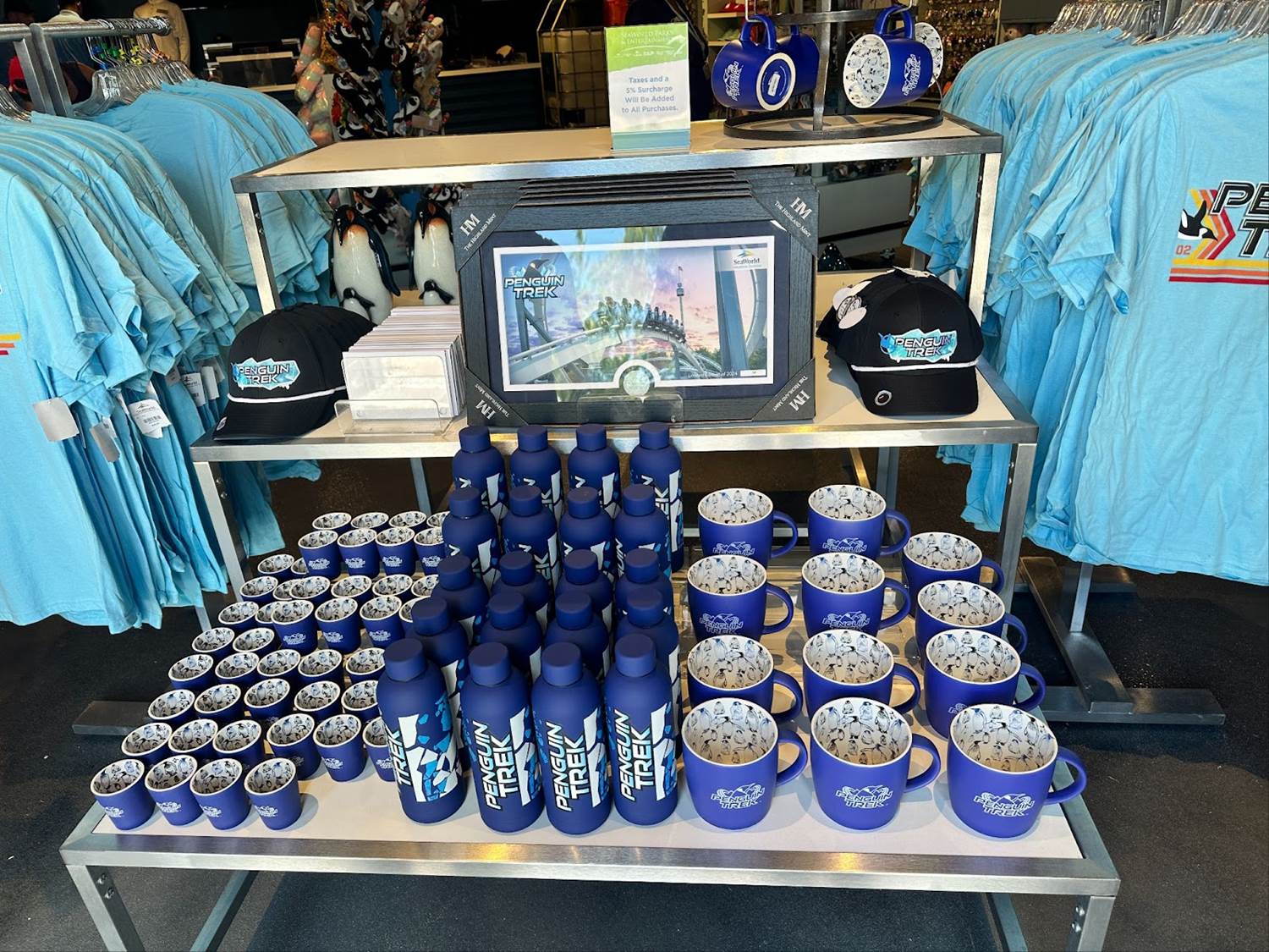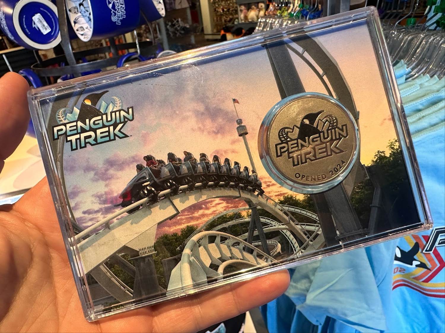 - In addition to the attraction, we got to checkout some of the brand new merch celebrating Penguin Trek. Some highlights include a framed piece of concept art for the coaster, a baseball cap, various glassware, and a commemorative coin.